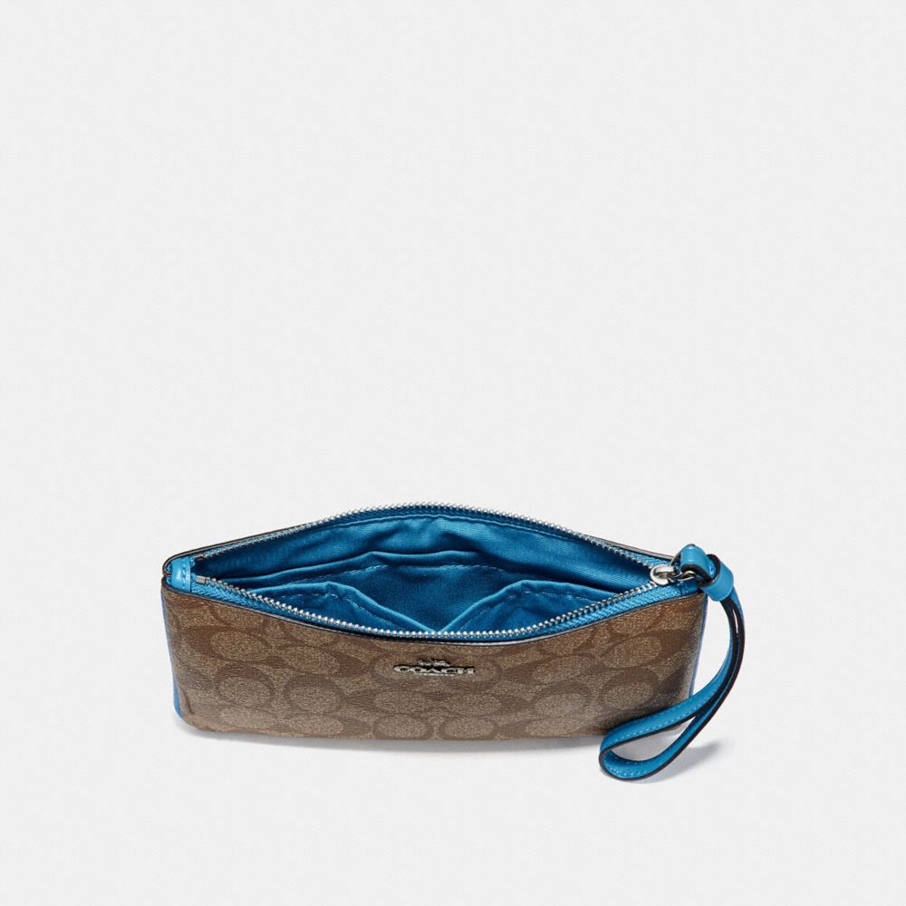 Signature coated canvas| Six credit card slots| Inside multifunction pocket| Zip-top closure, fabric lining| Wrist strap attached| 8" (L) x 4 3/4" (H) x 3/4" (W)