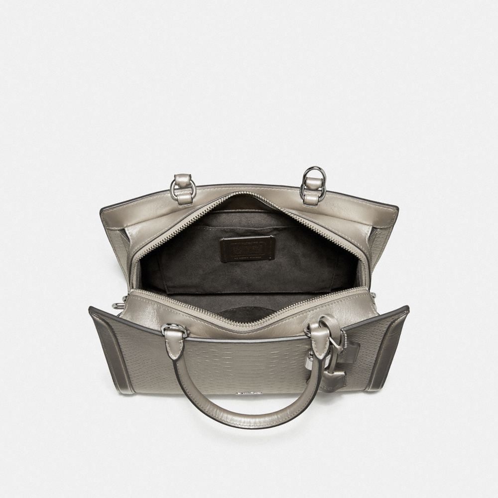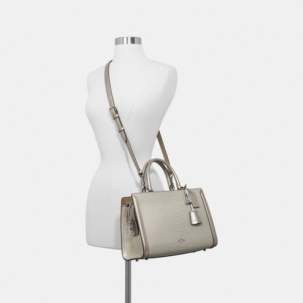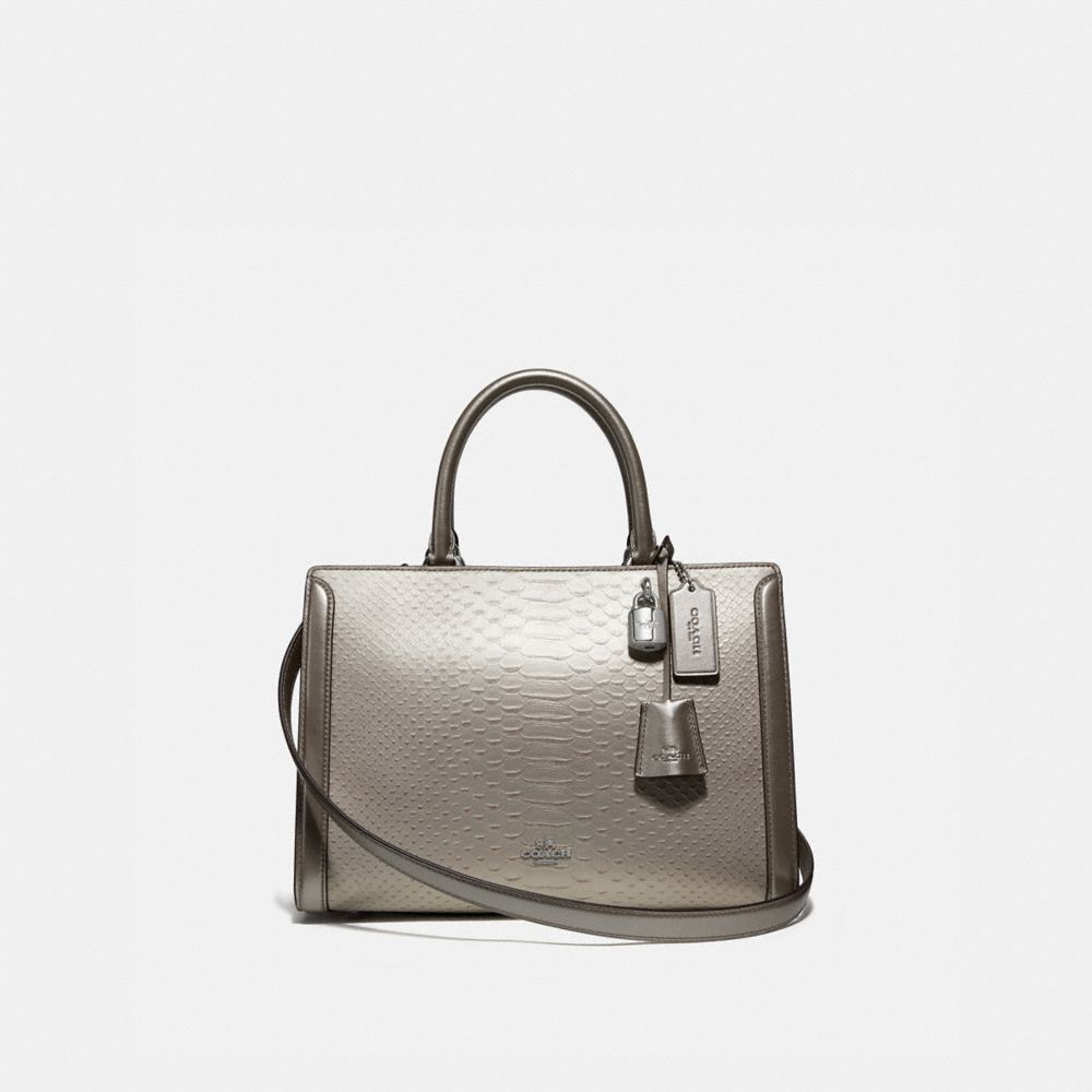| Snake-embossed leather and metallic refined calf leather| Inside multifunction pockets| Zip closure, fabric lining| Handles with 4 1/4" drop| Outside open pocket| Detachable strap with 21 1/4" drop for shoulder or crossbody wear| 11 1/2" (L) x 8" (H) x 5 1/4" (W)
