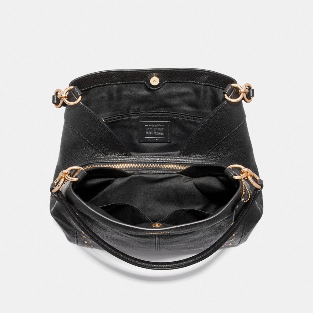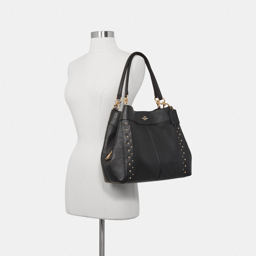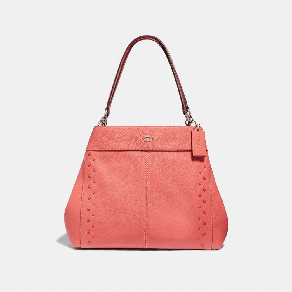 | Refined pebble leather| Inside zip, cell phone and multifunction pockets| Center zip compartment| Snap closure, fabric lining| Handles with 9 1/2" drop| 13" (L) x 10 3/4" (H) x 5" (W)