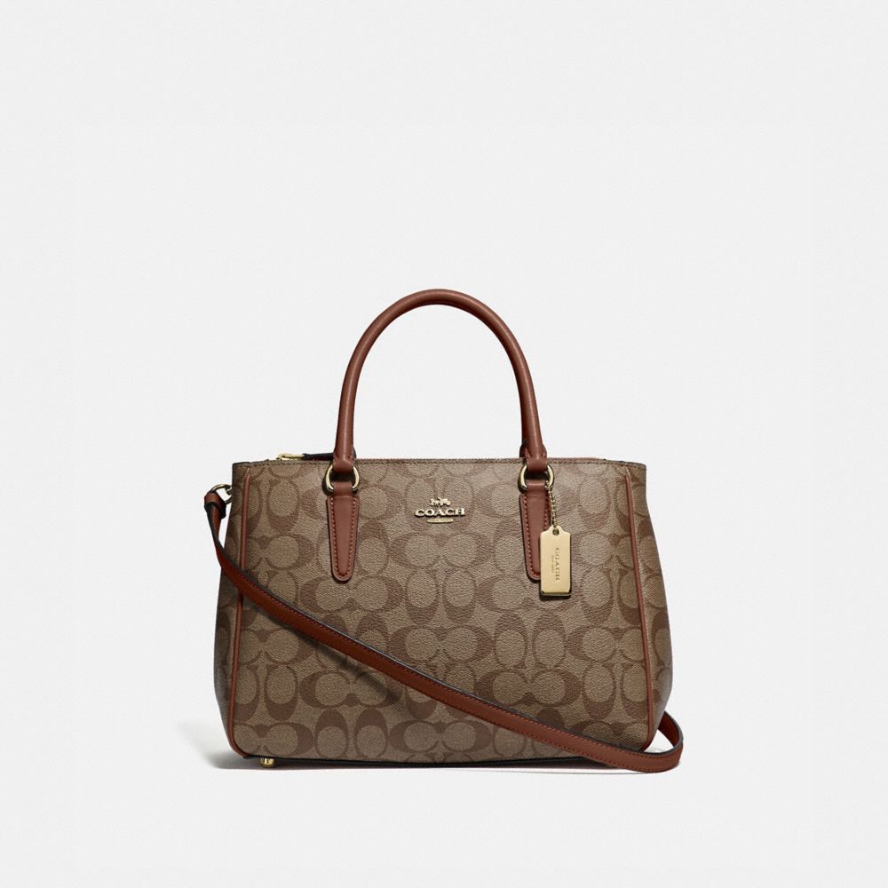 Signature coated canvas with smooth leather details| Inside cell phone and multifunction pockets| Snap closure, fabric lining| Side zip compartments| Handles with 4 1/4" drop| Detachable strap with 20 1/2" drop for shoulder or crossbody wear| 11 1/4" (L) x 8" (H) x 5" (W)