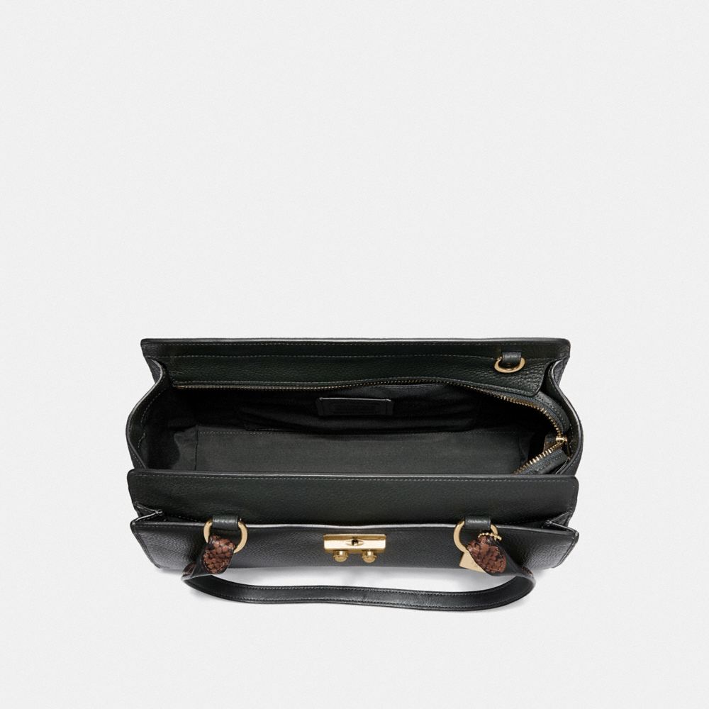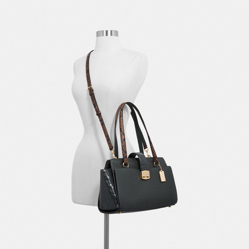 | Refined pebble leather, crocodile-embossed leather and snake-embossed leather| Inside multifunction pocket| Zip-top and push lock closures, fabric lining| Handles with 8 3/4" drop| Outside slip pocket| Detachable strap with 22" drop for shoulder or crossbody wear| 12 1/2" (L) x 7 3/4" (H) x 4 1/4" (W)