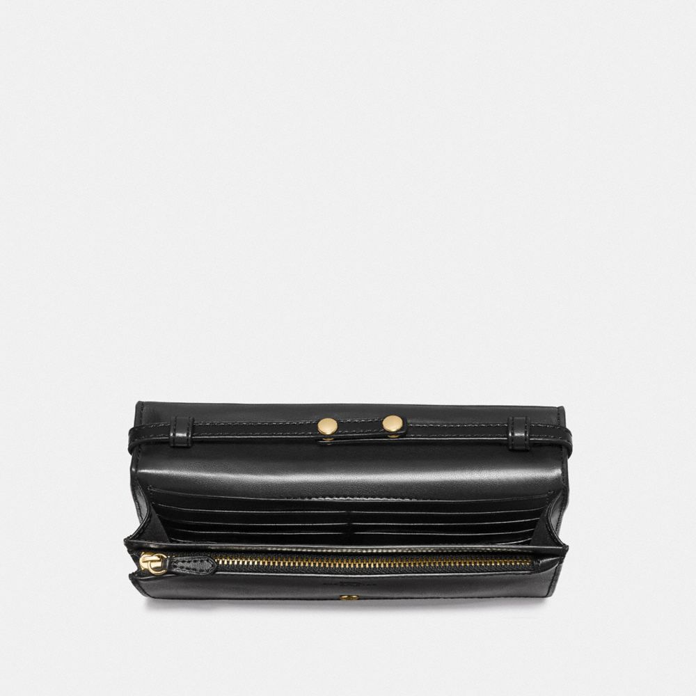 | Printed coated canvas and smooth leather| Eight credit card slots| Full-length bill compartment| Inside zip pocket| Snap closure| Outside slip pocket| Detachable strap with 23" drop for shoulder or crossbody wear| 8" (L) x 4 3/4" (H) x 1 1/2" (W)