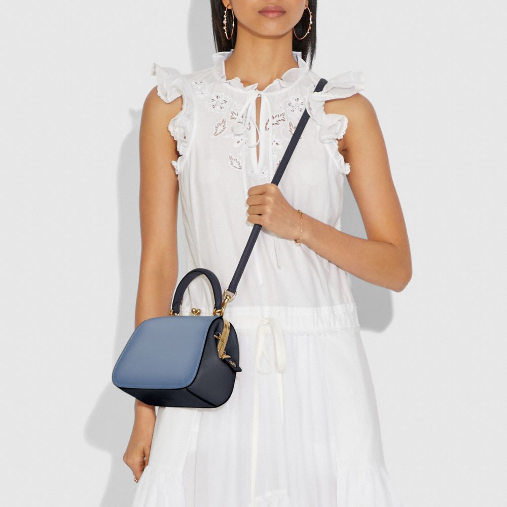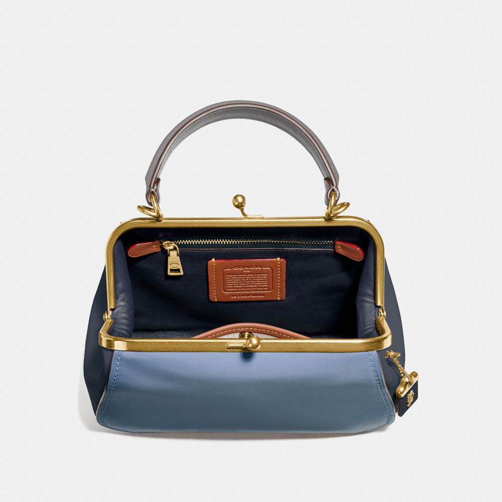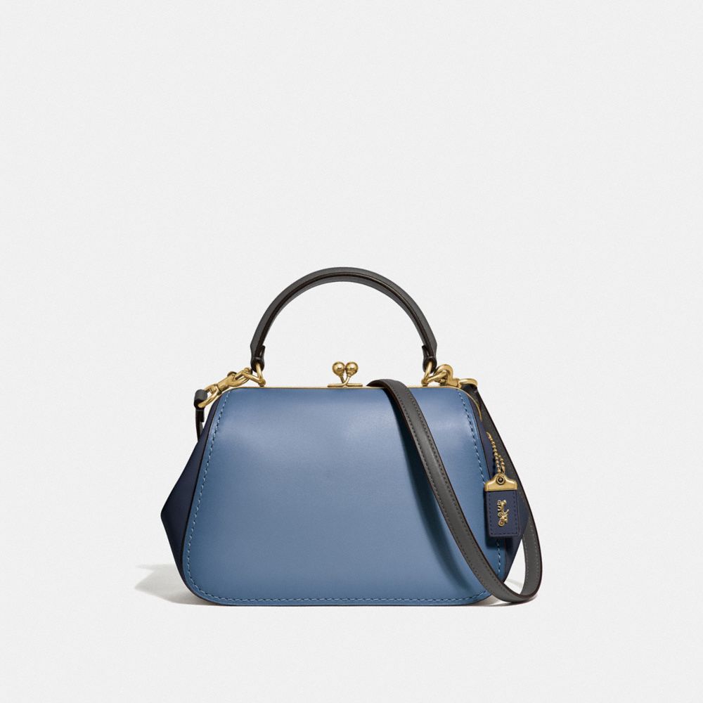 Glovetanned leather| Inside zip and snap pockets| Kisslock closure, leather lining| Handle with 3 1/4" drop| Outside slip pocket| Detachable strap with 22" drop for shoulder or crossbody wear| 9" (L) x 6" (H) x 3 1/2" (W)
