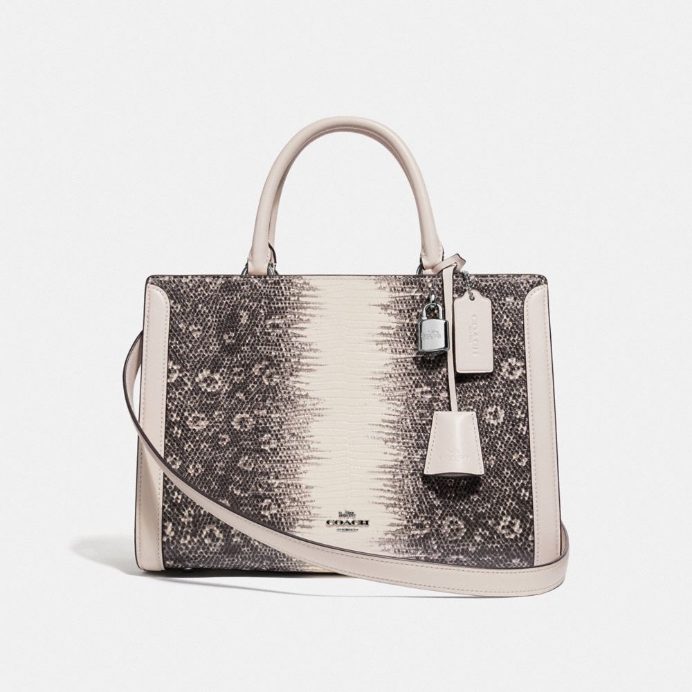 Lizard-embossed leather with refined calf leather details| Inside multifunction pockets| Zip closure, fabric lining| Handles with 4 1/4" drop| Outside open pocket| Detachable strap with 21 1/4" drop for shoulder or crossbody wear| 11 1/2" (L) x 8" (H) x 5 1/4" (W)