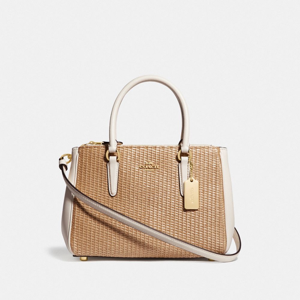 Synthetic straw with smooth leather details| Inside multifunction pockets| Snap closure, fabric lining| Side zip compartments| Handles with 4" drop| Detachable strap with 23" drop for shoulder or crossbody wear| 9 1/4" (L) x 6 3/4" (H) x 4 1/4" (W)