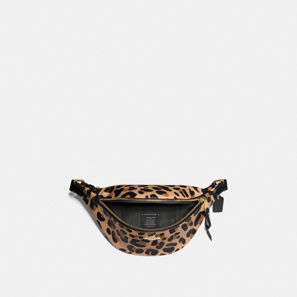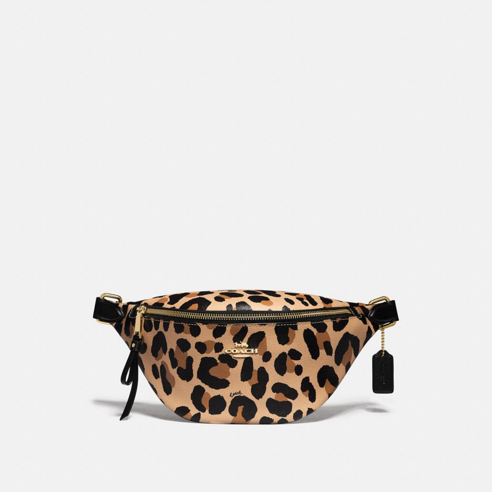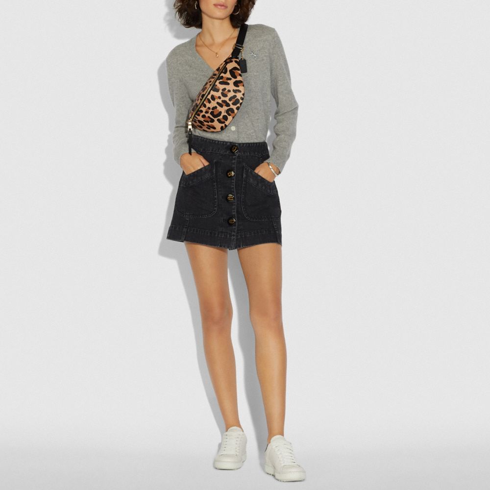 Printed coated canvas with smooth leather details| One credit card slot| Zip closure, fabric lining| Adjustable strap for wear at waist| 14 1/4" (L) x 5" (H) x 4 1/4" (W)