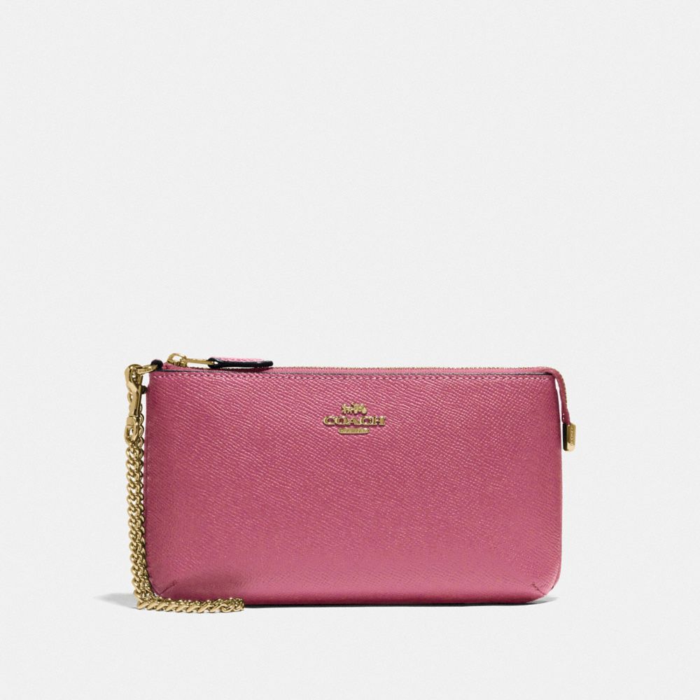 Crossgrain leather| Eight credit card slots| Zip-top closure, fabric lining| Wrist strap with dogleash clip attached| Outside open pocket| 7 3/4" (L) x 4 1/2" (H) x 1" (W)