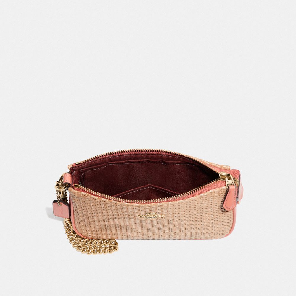 Synthetic straw and smooth leather| Two credit card slots| Inside multifunction pocket| Zip-top closure, fabric lining| Strap with clip to form a wrist strap or attach to the inside of a bag| 7 1/2" (L) x 4 1/2" (H) x 2" (W)