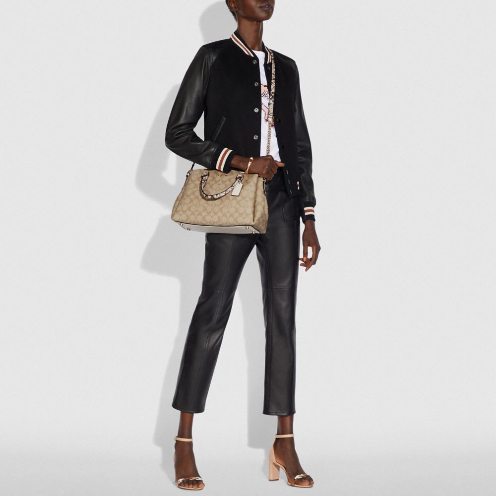 Signature coated canvas, refined pebble leather and snake-embossed leather| Inside multifunction pocket| Center zip compartment| Snap closure, fabric lining| Handles with 4" drop| Detachable strap with 20" drop for shoulder or crossbody wear| 11 1/2" (L) x 8 3/4" (H) x 5" (W)