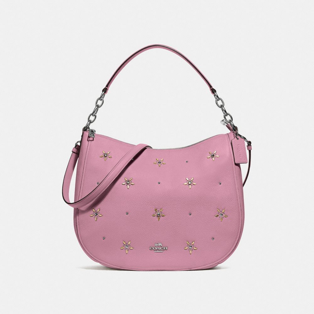 Refined pebble leather| Inside cell phone and multifunction pockets| Zip-top closure, fabric lining| Handle with 8 3/4" drop| Outside zip pocket| Detachable strap with 15 1/4" drop for shoulder wear| 13" (L) x 10 3/4" (H) x 4" (W)