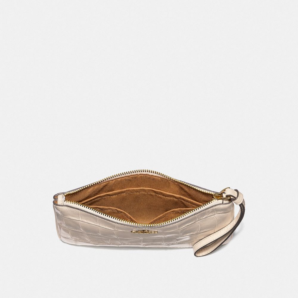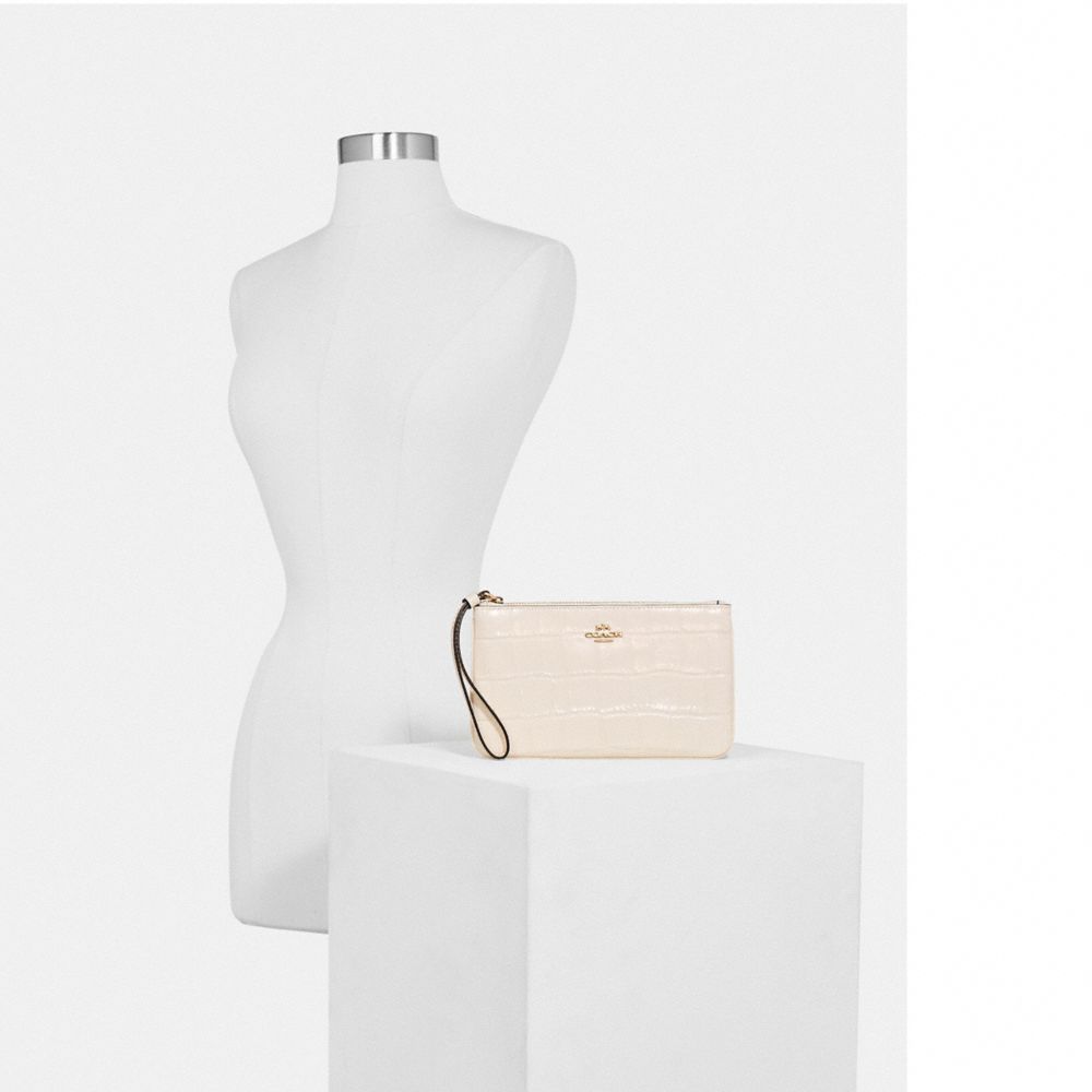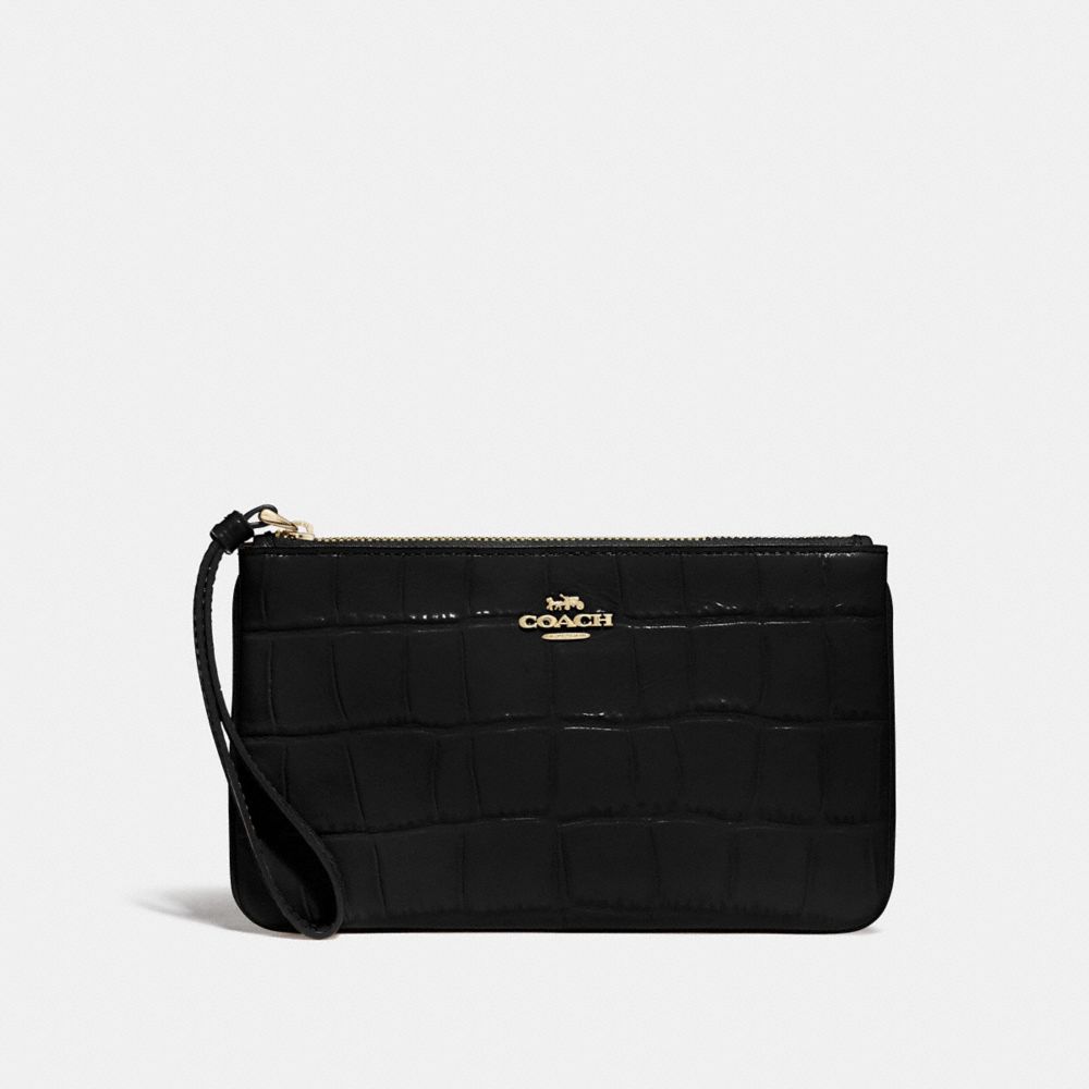 Crocodile-embossed leather| Six credit card slots| Inside multifunction pocket| Zip-top closure, fabric lining| Wrist strap attached| 8" (L) x 4 3/4" (H) x 3/4" (W)