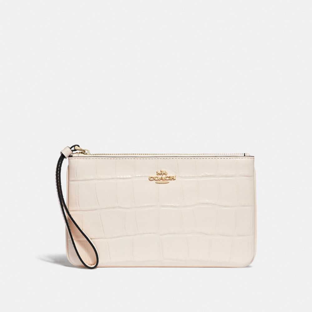 Crocodile-embossed leather| Six credit card slots| Inside multifunction pocket| Zip-top closure, fabric lining| Wrist strap attached| 8" (L) x 4 3/4" (H) x 3/4" (W)