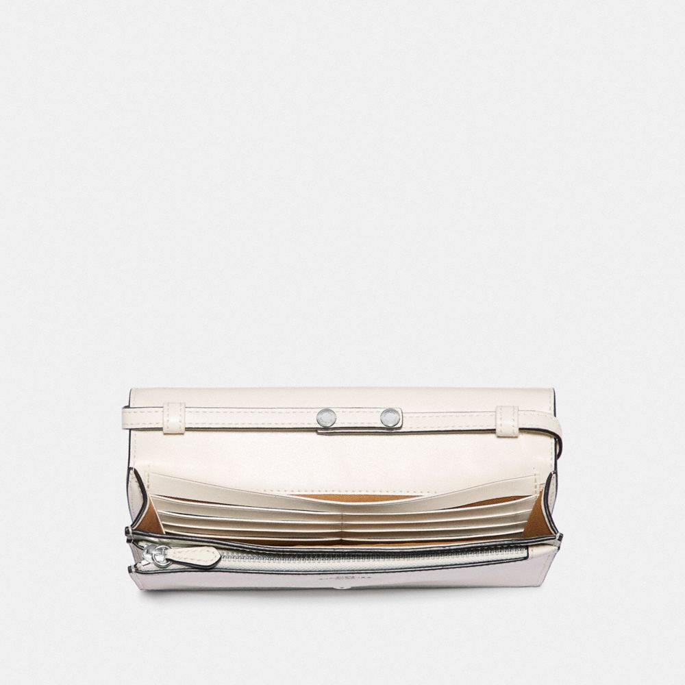 Printed coated canvas with smooth leather details| Eight credit card slots| Full-length bill compartment| Inside zip pocket| Snap closure| Outside slip pocket| Detachable strap with 23" drop for shoulder or crossbody wear| 8" (L) x 4 3/4" (H) x 1 1/2" (W)