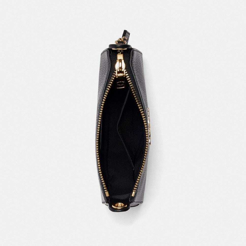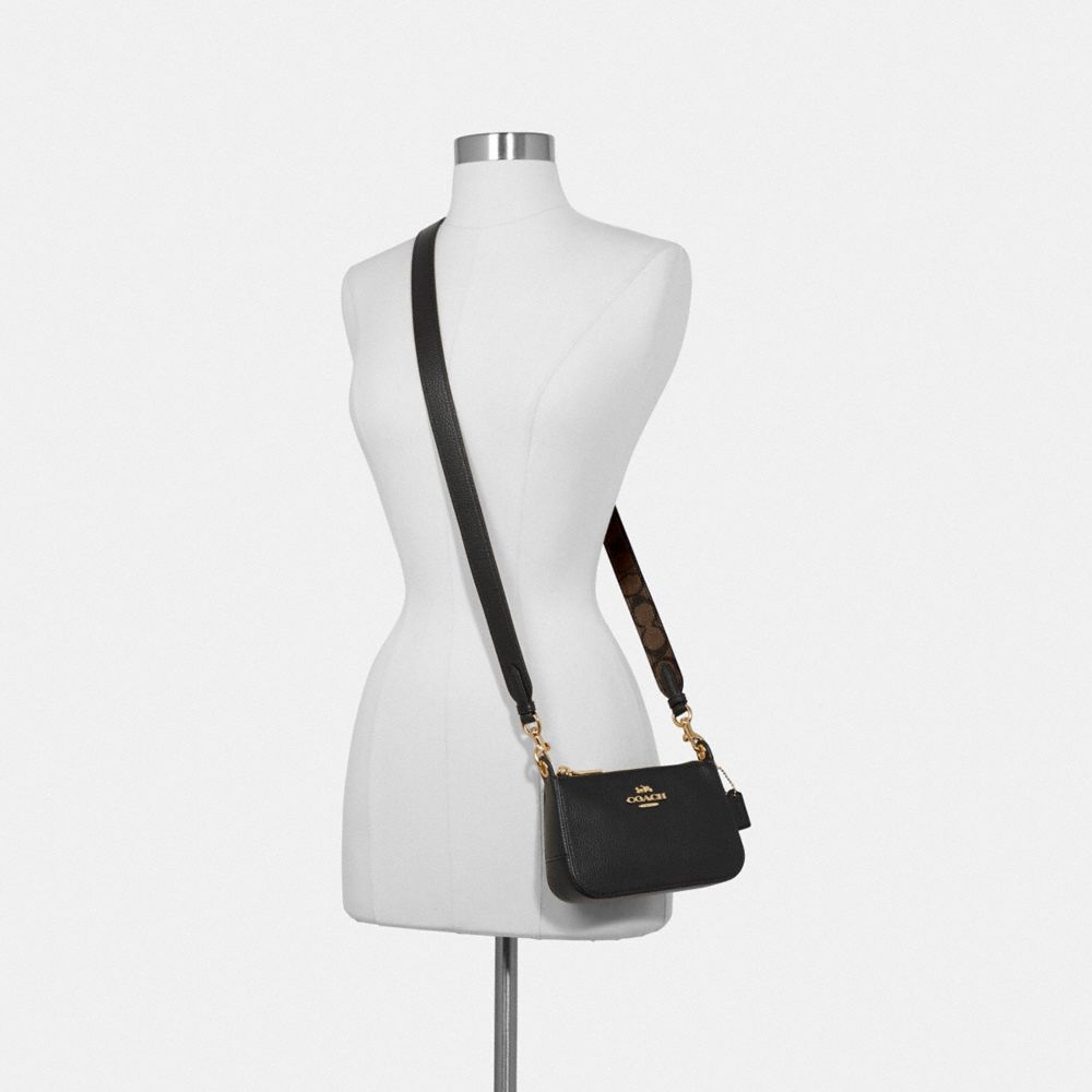 Refined pebble leather and Signature coated canvas| Two credit card slots| Zip-top closure, fabric lining| Detachable strap with 23" drop for shoulder or crossbody wear| 7" (L) x 4 1/4" (H) x 1 3/4" (W)