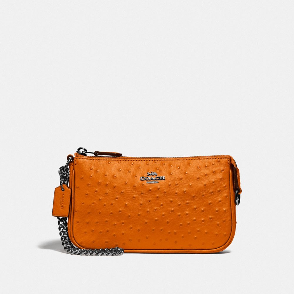 Ostrich-embossed leather| Two credit card slots| Inside multifunction pocket| Zip-top closure, fabric lining| Strap with clip to form a wrist strap or attach to the inside of a bag| 7 1/2" (L) x 4 1/2" (H) x 2" (W)