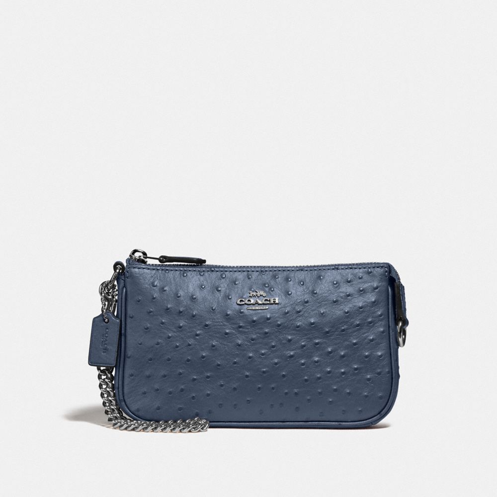 Ostrich-embossed leather| Two credit card slots| Inside multifunction pocket| Zip-top closure, fabric lining| Strap with clip to form a wrist strap or attach to the inside of a bag| 7 1/2" (L) x 4 1/2" (H) x 2" (W)