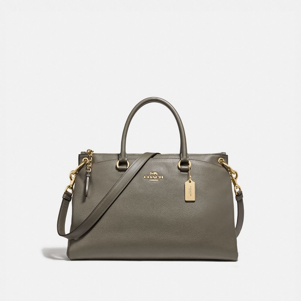 Refined pebble leather, suede and smooth leather| Inside snap pockets| Zip-top closure, fabric lining| Handles with 8 3/4" drop| Outside slip pockets with magnetic snap closure| Detachable strap with 20" drop for shoulder or crossbody wear| 12 3/4" (L) x 8 3/4" (H) x 5 1/4" (W)