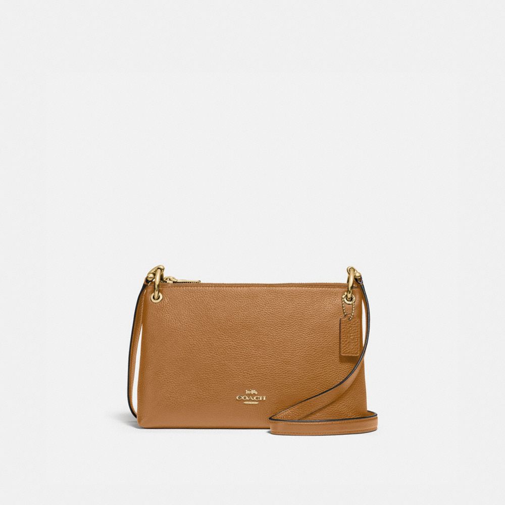 Refined pebble leather| Two credit card slots| Inside multifunction pocket| Center snap compartment| Double zip closure, fabric lining| Adjustable strap with 22 3/4" drop for shoulder or crossbody wear| 9 3/4" (L) x 6 3/4" (H) x 2 3/4" (W)