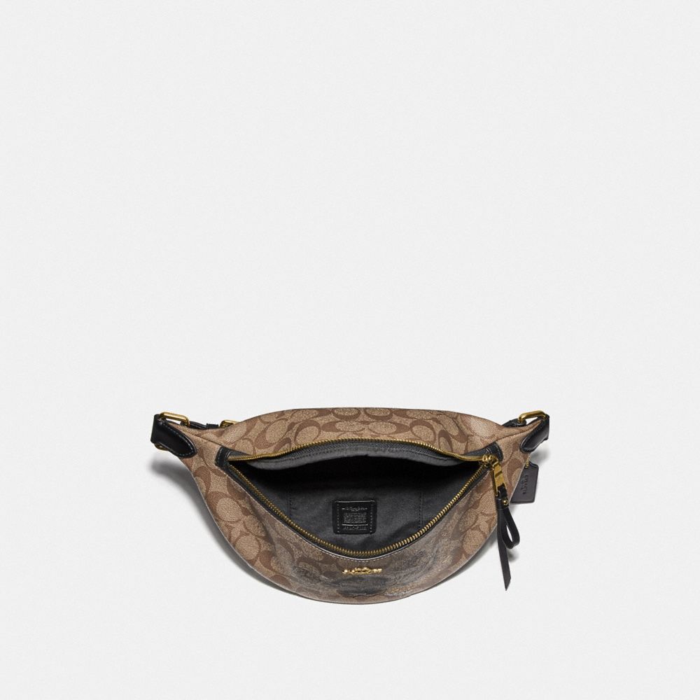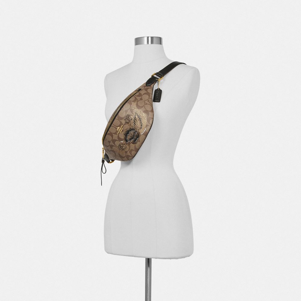 Signature coated canvas and smooth leather| One credit card slot| Zip closure, fabric lining| Adjustable strap for wear at waist| 14 1/4" (L) x 5" (H) x 4 1/4" (W)| Featuring graphics created exclusively for Coach by tattoo artist Chelsea Champlain