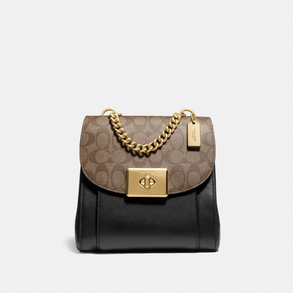 Signature coated canvas and smooth leather| Inside multifunction pocket| Turnlock closure, fabric lining| Chain top handle with 3 1/2" drop| Adjustable shoulder straps| 9" (L) x 9" (H) x 4 1/2" (W)