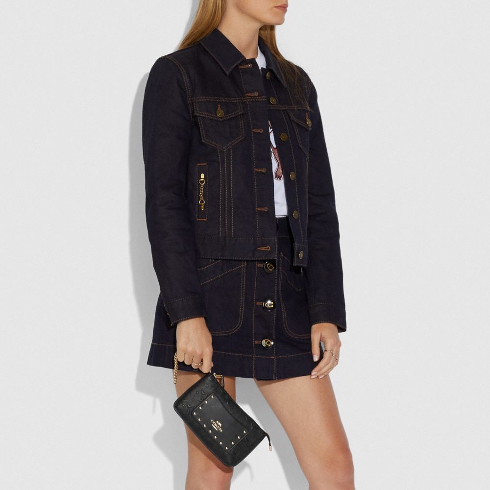Signature smooth calf leather| Eight credit card slots| Zip-top closure, fabric lining| Wrist strap with dogleash clip attached| Outside open pocket| 7 3/4" (L) x 4 1/2" (H) x 1" (W)