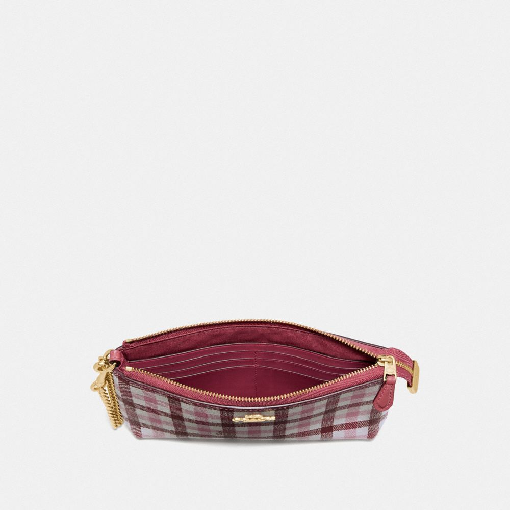 Printed coated canvas| Eight credit card slots| Zip-top closure, fabric lining| Wrist strap with dogleash clip attached| Outside open pocket| 7 3/4" (L) x 4 1/2" (H) x 1" (W)