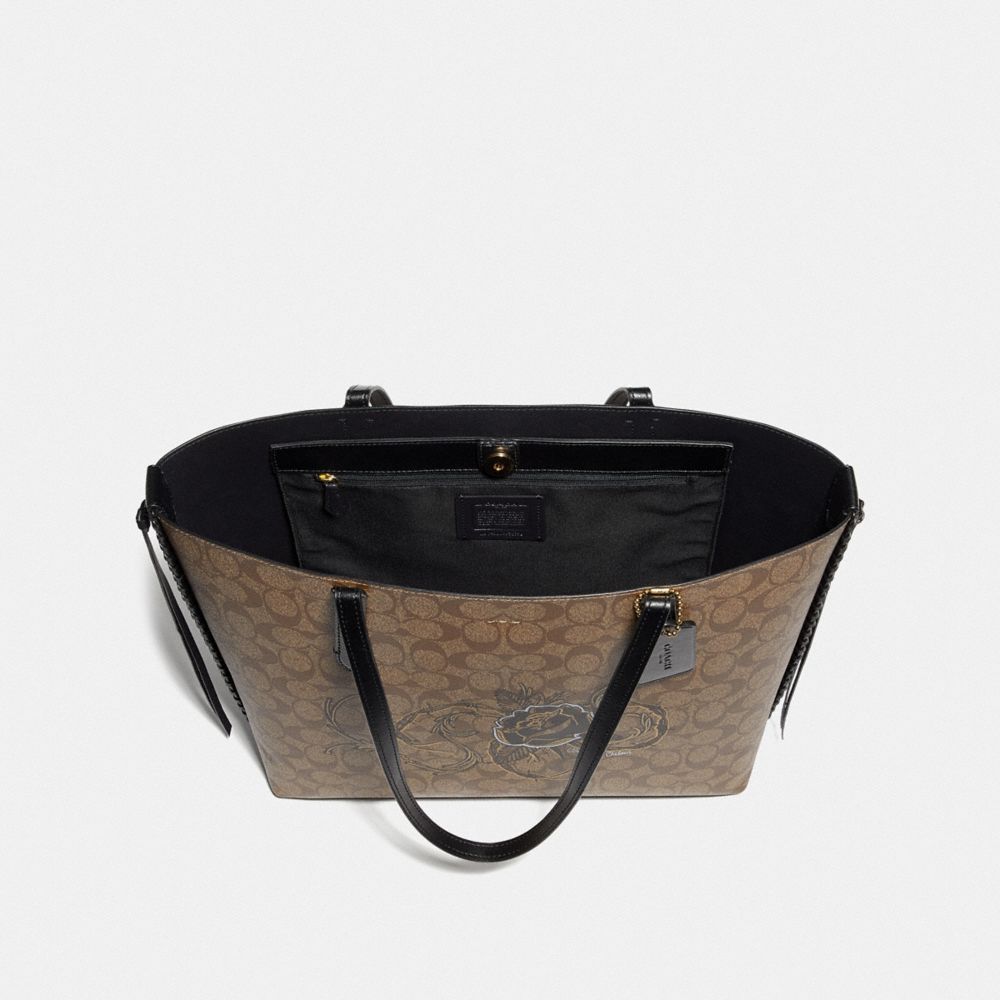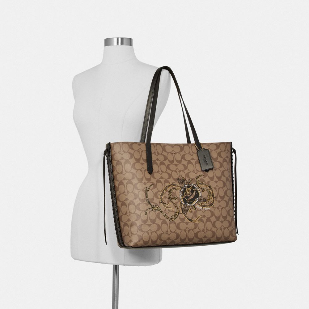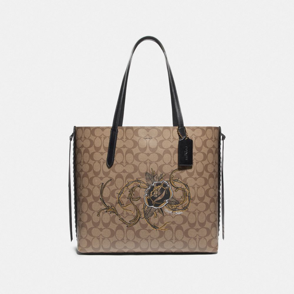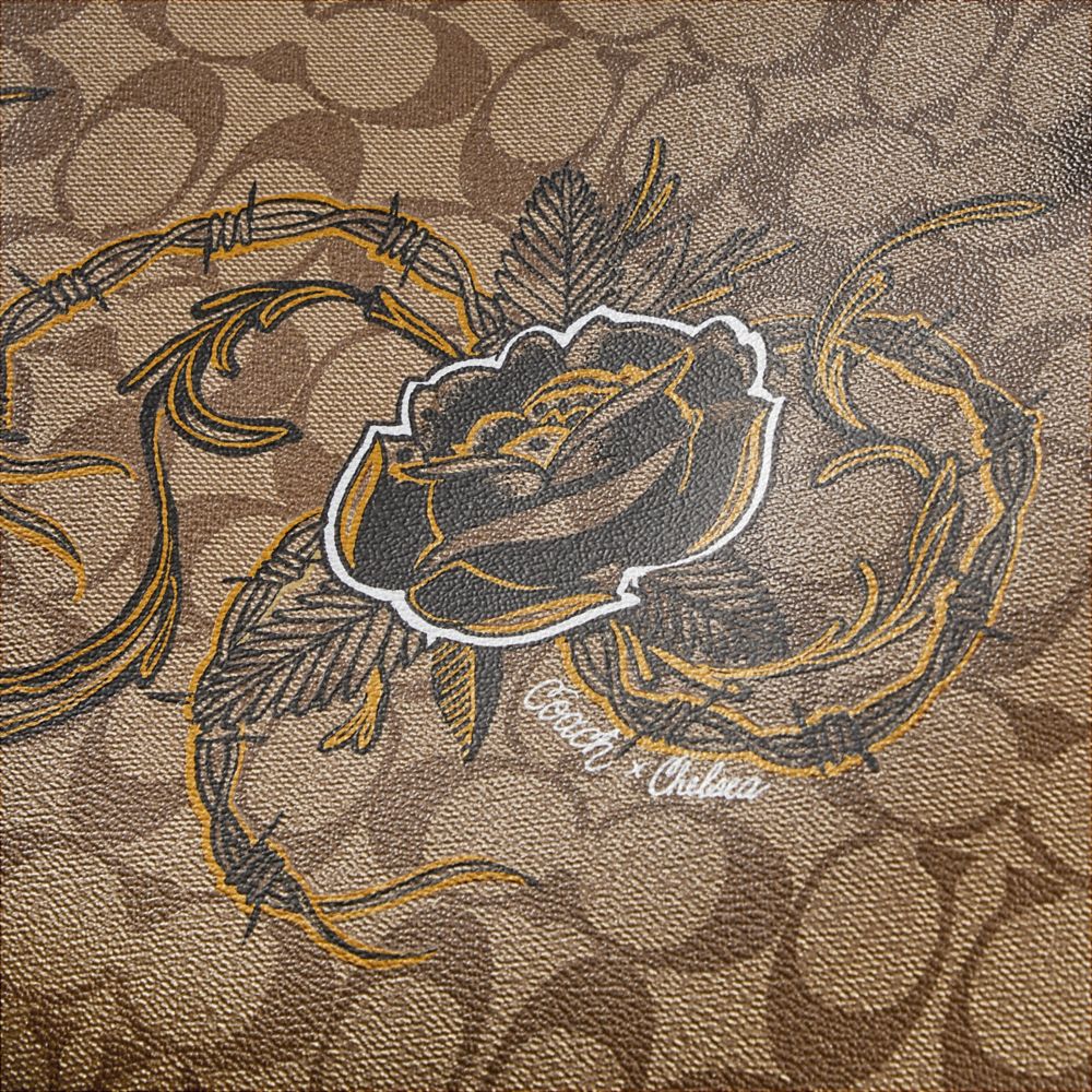 Signature coated canvas with smooth leather details| Inside zip pocket| Snap closure| Handles with 10" drop| 13 1/2" (L) x 12 3/4" (H) x 5" (W)| Featuring graphics created exclusively for Coach by tattoo artist Chelsea Champlain