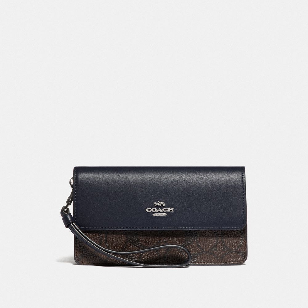 Signature coated canvas and smooth leather| One credit card slot| Snap closure, fabric lining| Outside zip pocket| Detachable wrist strap| 7" (L) x 4" (H) x 1 3/4" (W)