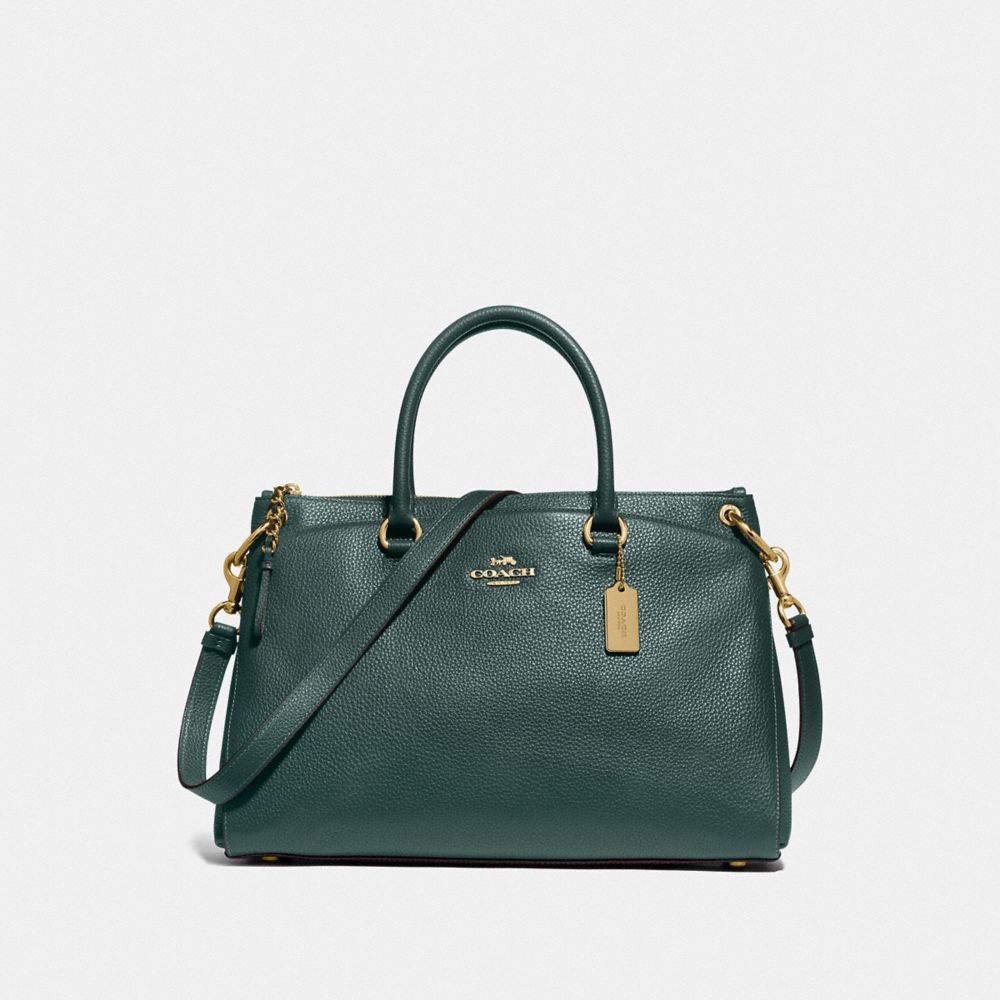Refined pebble leather| Inside snap pockets| Zip-top closure, fabric lining| Handles with 8 3/4" drop| Outside slip pockets with magnetic snap closure| Detachable strap with 20" drop for shoulder or crossbody wear| 12 3/4" (L) x 8 3/4" (H) x 5 1/4" (W)