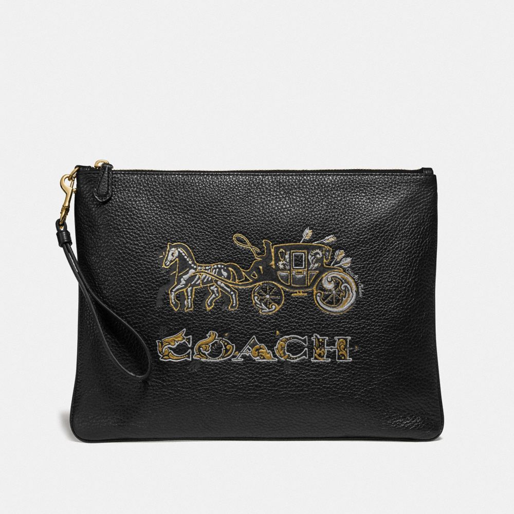Refined pebble leather| Zip-top closure, fabric lining| Detachable wrist strap| 11 3/4" (L) x 8 3/4" (H) x 3/4" (W)| Featuring graphics created exclusively for Coach by tattoo artist Chelsea Champlain