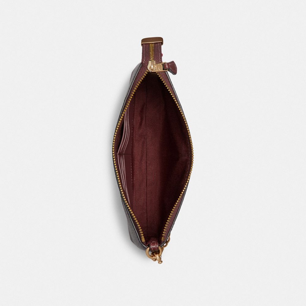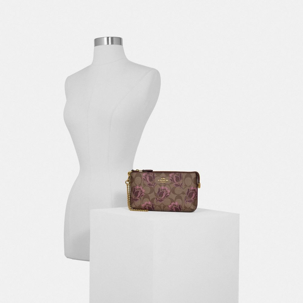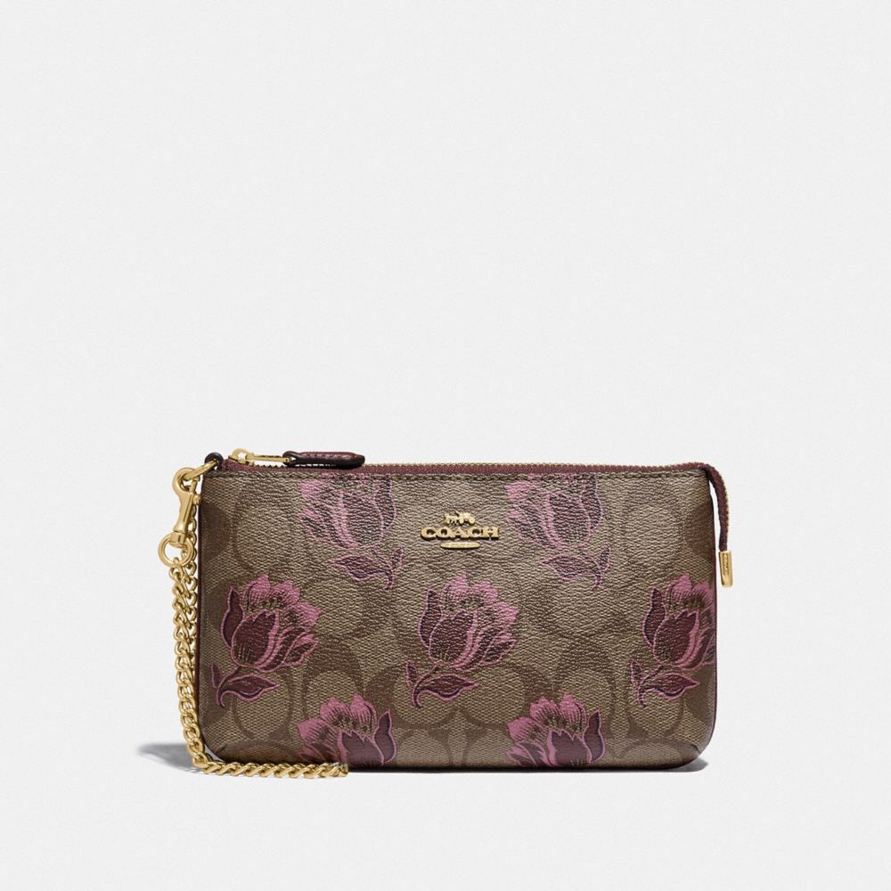 Signature coated canvas with smooth leather details| Eight credit card slots| Zip-top closure, fabric lining| Wrist strap with dogleash clip attached| Outside open pocket| 8" (L) x 4 3/4" (H) x 3/4" (W)