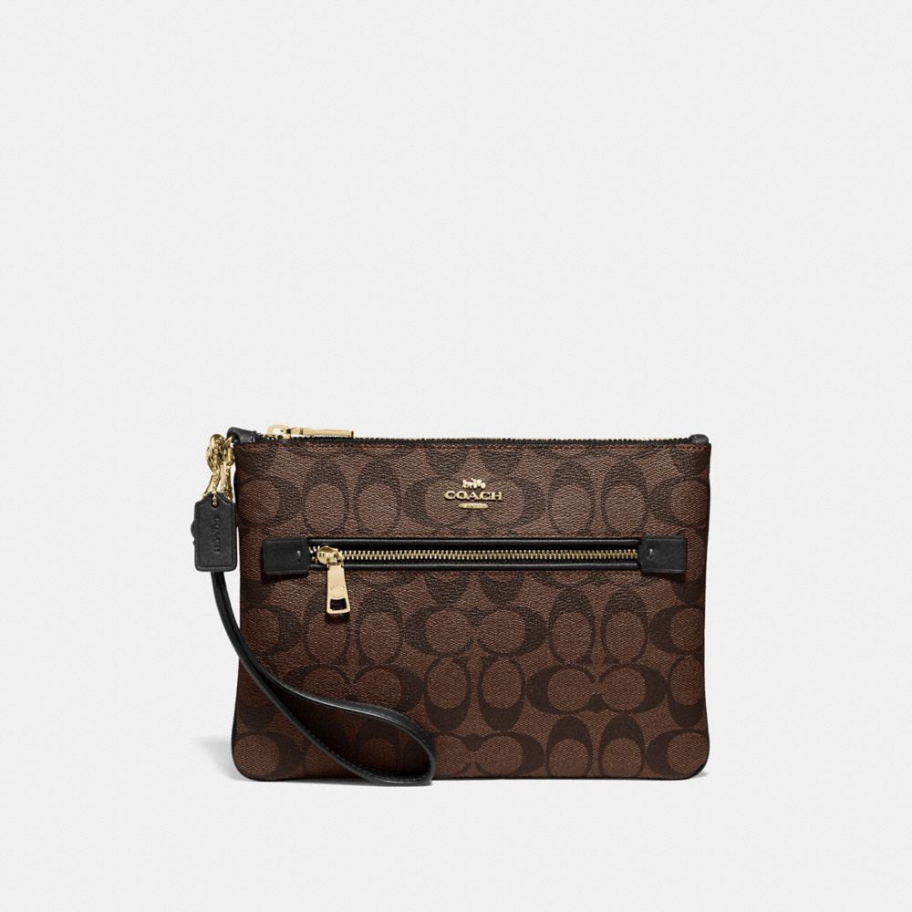 Signature coated canvas with smooth leather details| Two credit card slots| Zip-top closure, fabric lining| Outside zip pocket| Detachable wrist strap| 9 1/4" (L) x 6 3/4" (H)