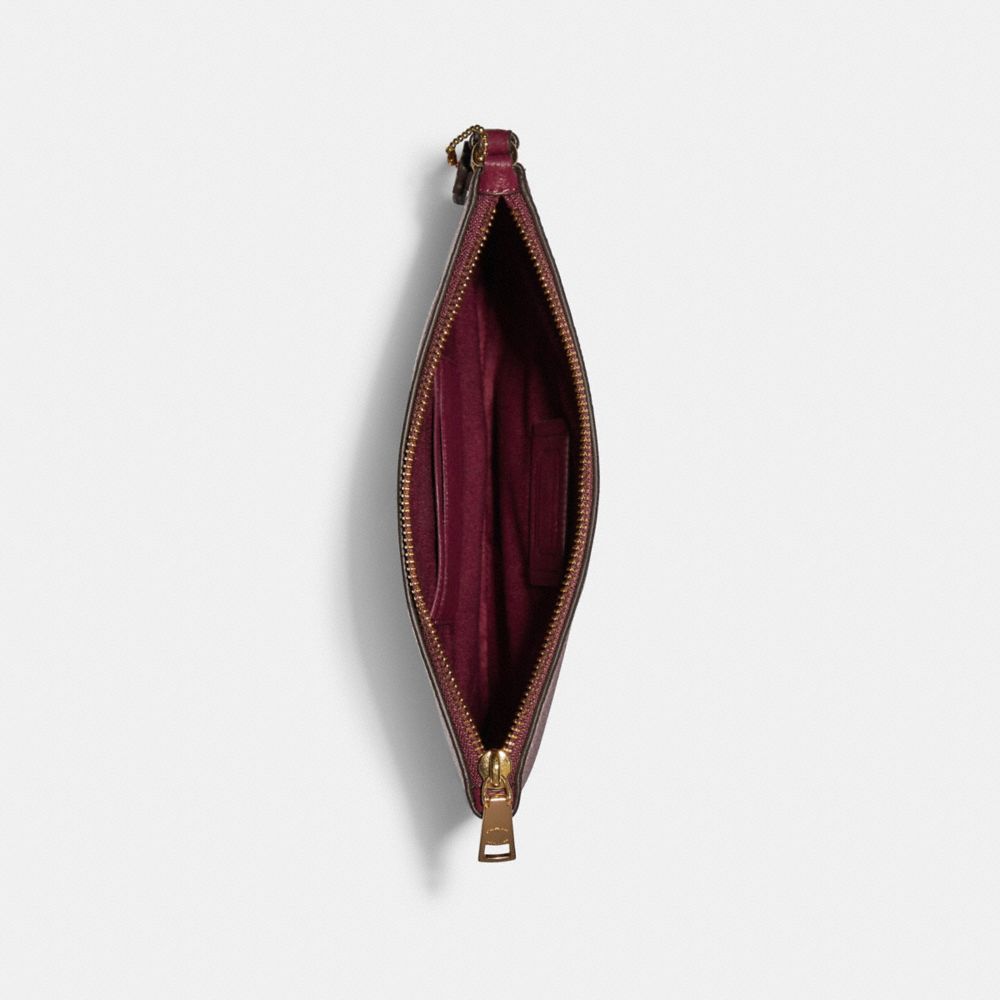 Refined pebble leather| Two credit card slots| Zip-top closure, fabric lining| Outside zip pocket| Detachable wrist strap| 9 1/4" (L) x 6 3/4" (H)