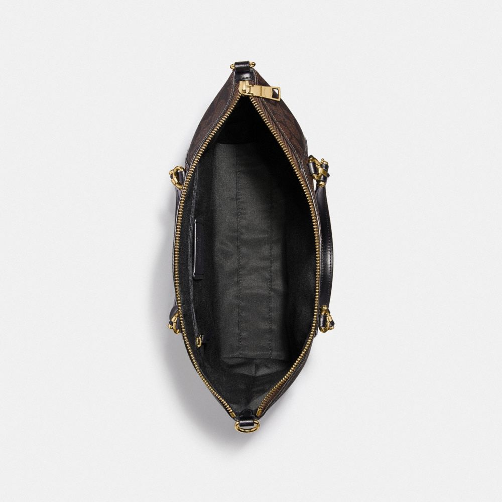 Signature coated canvas with smooth leather details| Inside zip pocket| Zip-top closure, fabric lining| Handles with 5" drop| Outside zip pocket| Detachable strap with 21" drop for shoulder or crossbody wear| 10 1/2" (L) x 8 3/4" (H) x 3 3/4" (W)