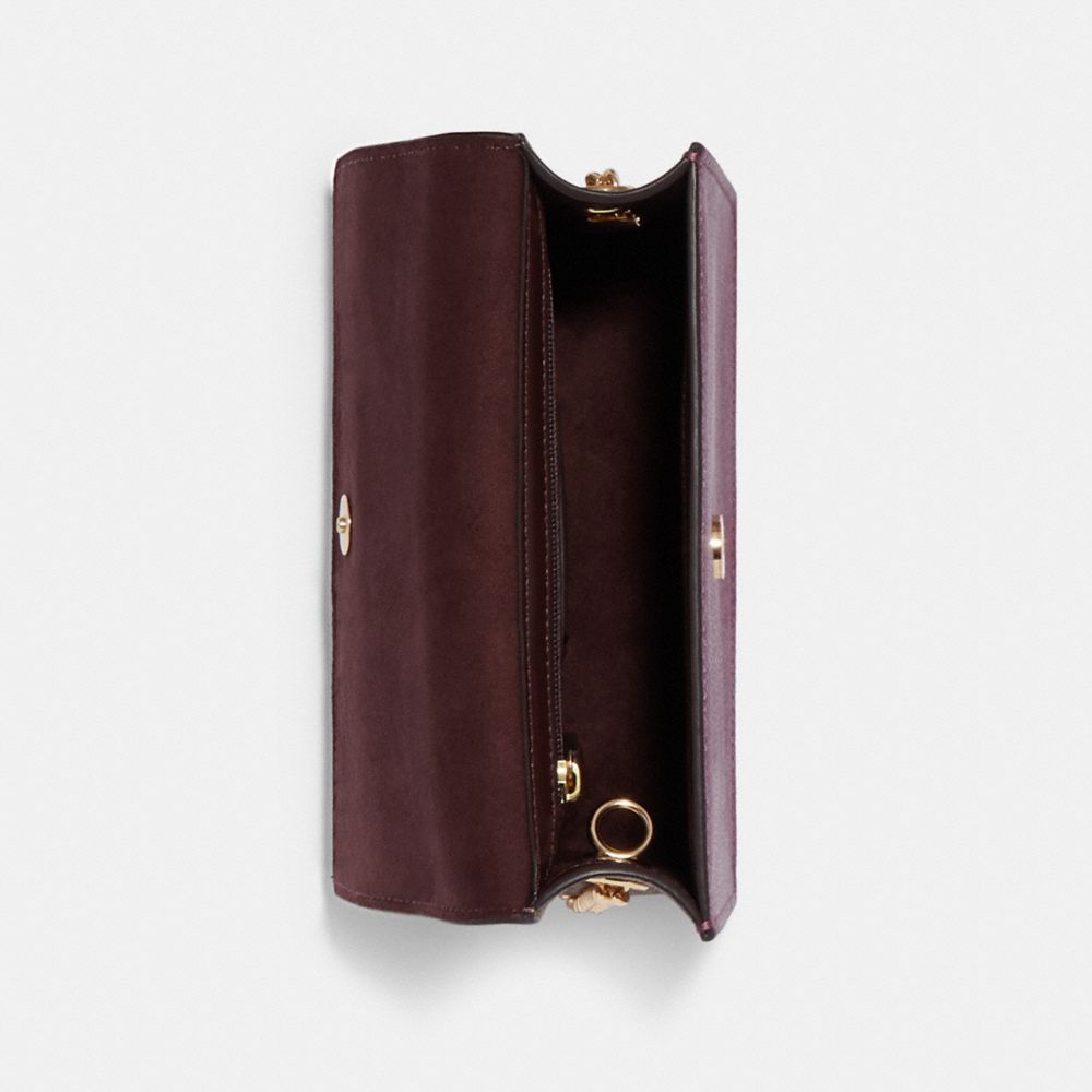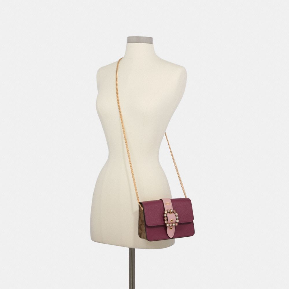 Crossgrain leather and Signature coated canvas| Inside zip pocket| Snap closure, fabric lining| Outside slip pocket| Strap with 22" drop for shoulder or crossbody wear| 7" (L) x 5" (H) x 3" (W)