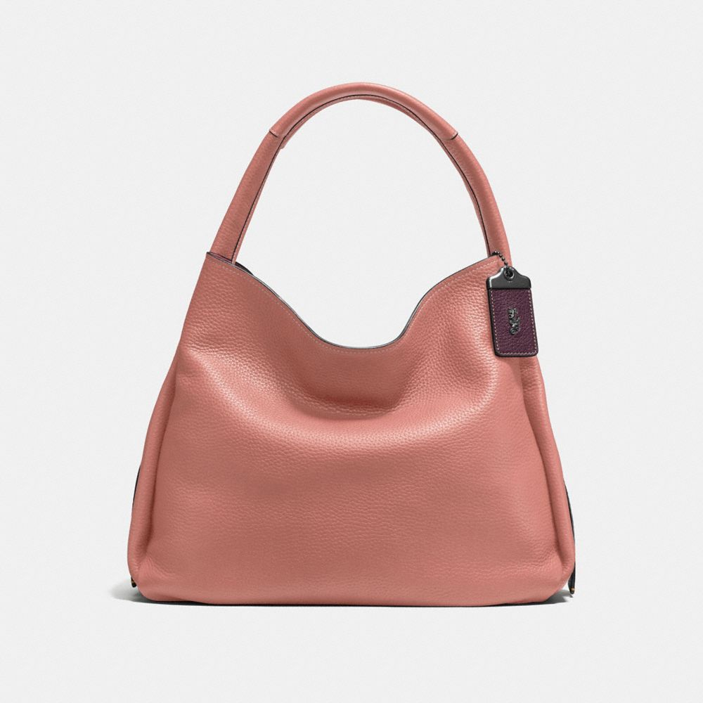 Natural pebble leather| Removable leather pouch| Magnetic snap closure, suede lining| Handles with 12" drop| 14 1/2" (L) x 13" (H) x 5 1/2" (W)