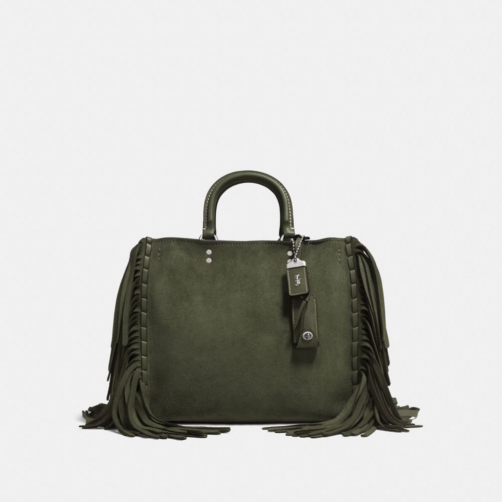 Cervo suede| Inside zip and French purse pockets| Zip closure, fabric and leather lining| Two open compartments| Handles with 3 1/2" drop| Detachable straps with 10" drop for shoulder wear| Shoulder straps can be linked together for crossbody wear| 12 1/4" (L) x 9 3/4" (H) x 5 1/2" (W)