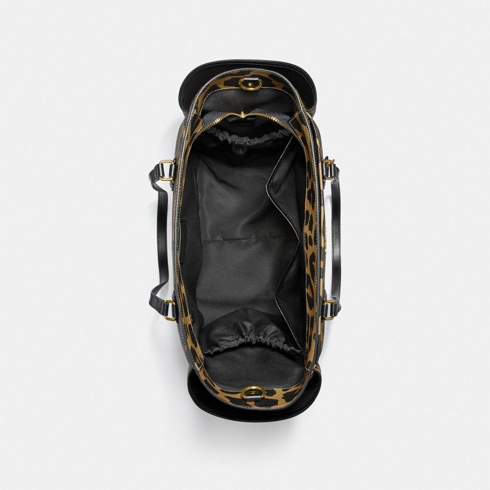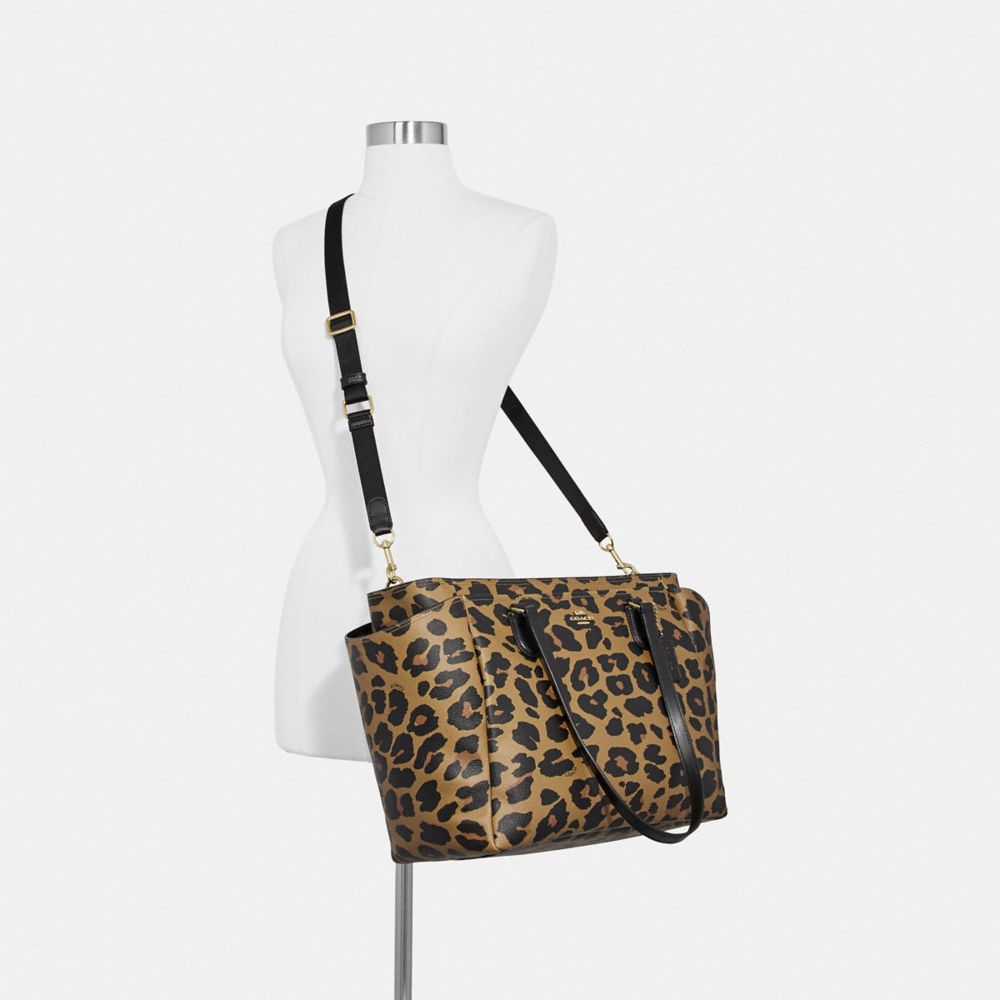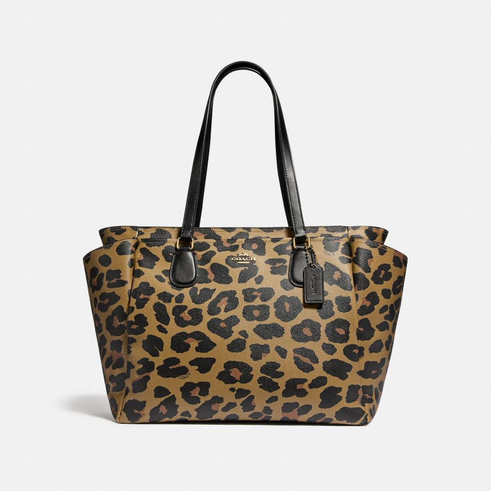 Printed coated canvas with smooth leather details| Inside zip and multifunction pockets| Zip-top closure, fabric lining| Handles with 10 3/4" drop| Front pocket with snap closure| Side gusset pockets| Detachable strap with 22" drop for shoulder or crossbody wear| Changing pad included| 17" (L) x 11 3/4" (H) x 7" (W)