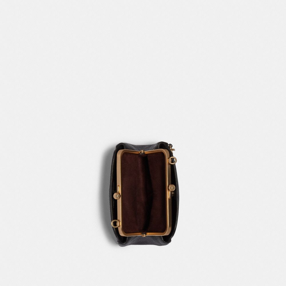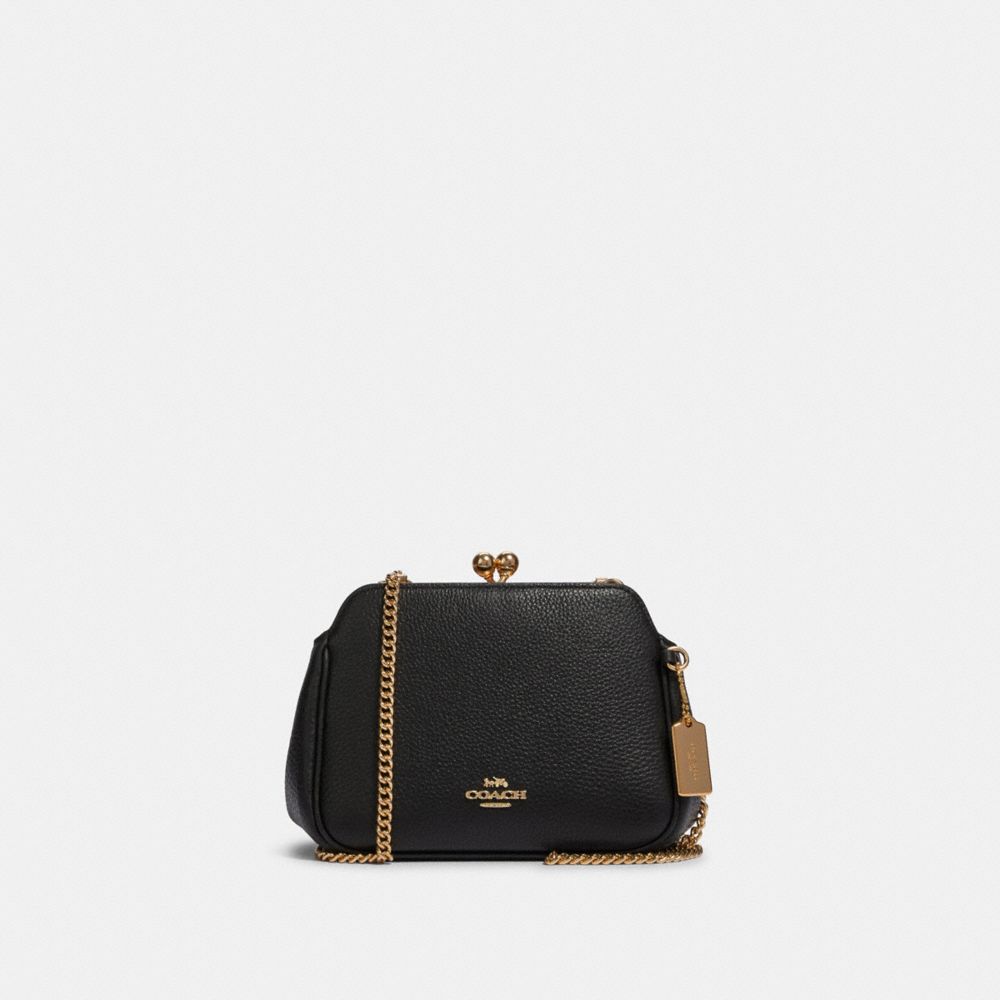 Refined pebble leather| Center kisslock compartment| Snap closure, fabric lining| Detachable chain strap with 22 3/4" drop for shoulder or crossbody wear| 6 3/4" (L) x 5 1/4" (H) x 3 1/2" (W)