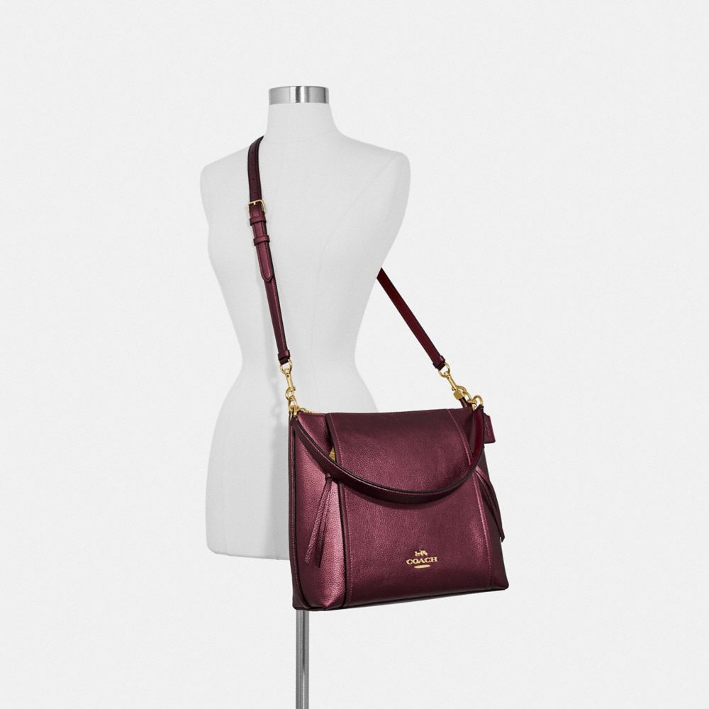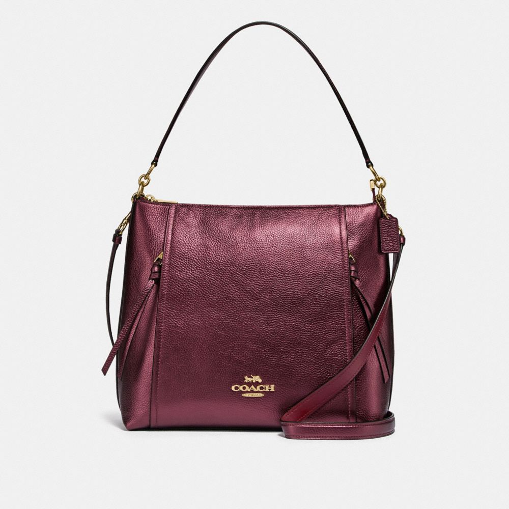 Metallic refined pebble leather| Inside zip pocket| Zip-top closure, fabric lining| Handle with 9" drop| Outside zip pockets| Detachable strap with 20" drop for shoulder or crossbody wear| 12 3/4" (L) x 11 1/4" (H) x 4 1/2" (W)