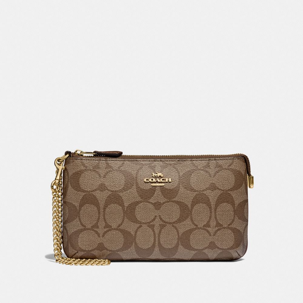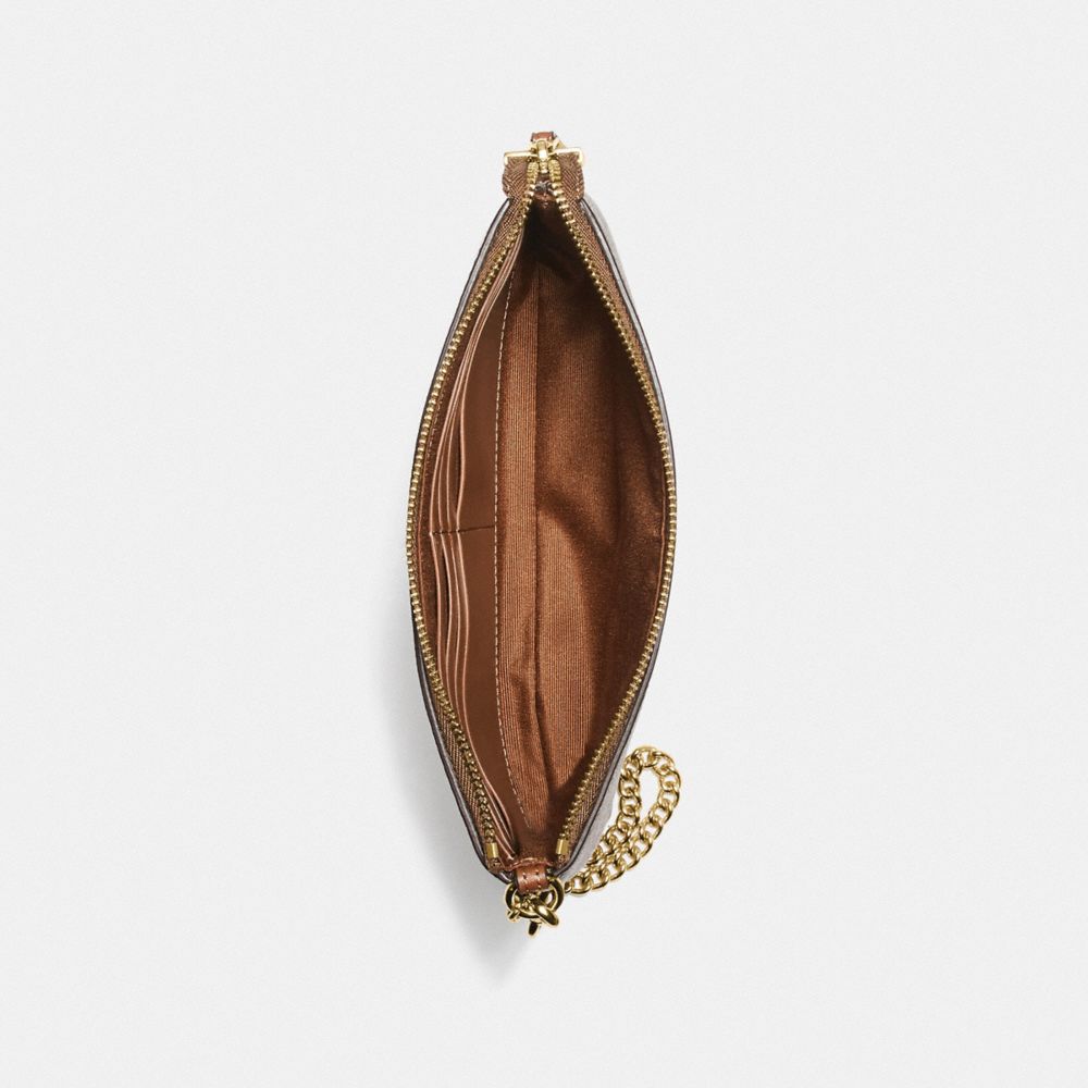 Signature coated canvas with smooth leather details| Eight credit card slots| Zip-top closure, fabric lining| Wrist strap with dogleash clip attached| Outside open pocket| 8" (L) x 4 3/4" (H) x 3/4" (W)