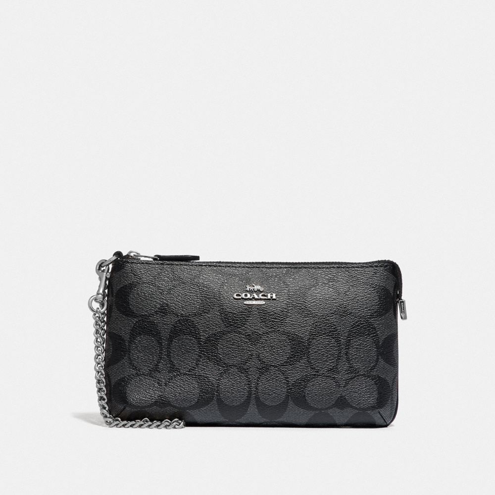 Signature coated canvas with smooth leather details| Eight credit card slots| Zip-top closure, fabric lining| Wrist strap with dogleash clip attached| Outside open pocket| 8" (L) x 4 3/4" (H) x 3/4" (W)