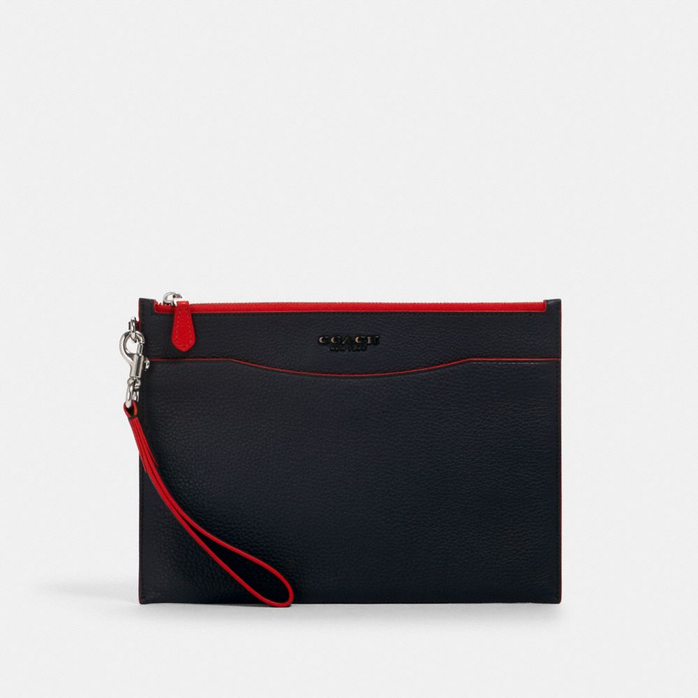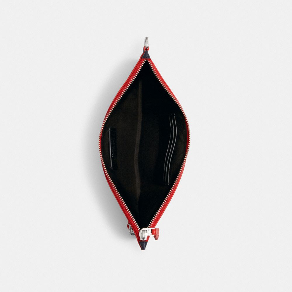 Refined pebble leather| Two credit card slots| Zip-top closure, fabric lining| Outside zip and snap pockets| Detachable wrist strap| 7 1/2" (L) x 4" (H)