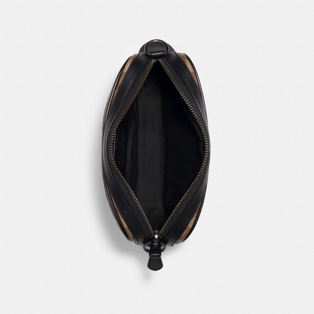 Signature coated canvas and refined calf leather| Inside multifunction pocket| Zip closure, fabric lining| Outside zip and slip pockets| Detachable strap with 25" drop for shoulder or crossbody wear| 9" (L) x 5 3/4" (H) x 2 1/4" (W)