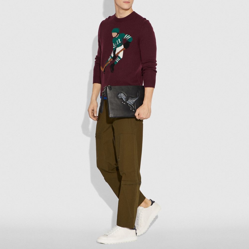 Refined calf leather| Inside zip pocket| Zip-top closure, fabric lining| Detachable wrist strap| 11 3/4" (L) x 8 3/4" (H)
