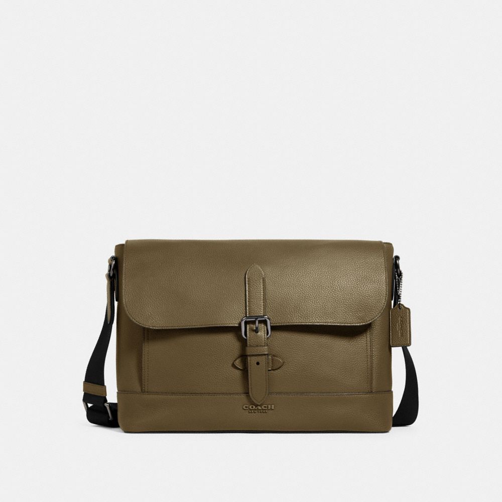 Natural pebble leather| Inside zip, cell phone and multifunction pockets| Inside laptop sleeve with secure tab| Flap closure, fabric lining| Outside slip pocket| Adjustable strap with 25" drop for shoulder or crossbody wear| 13 1/2" (L) x 9 3/4" (H) x 3 1/2" (W)