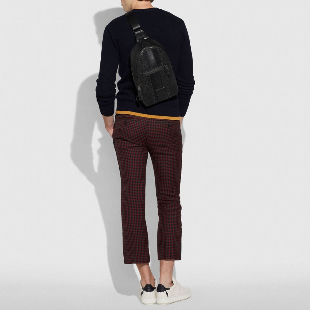 Buffalo-embossed leather and suede| Inside tech sleeve with secure tab| Zip closure, fabric lining| Outside zip pocket| Adjustable strap for crossbody wear| 7 3/4" (L) x 13 1/2" (H) x 2 3/4" (W)