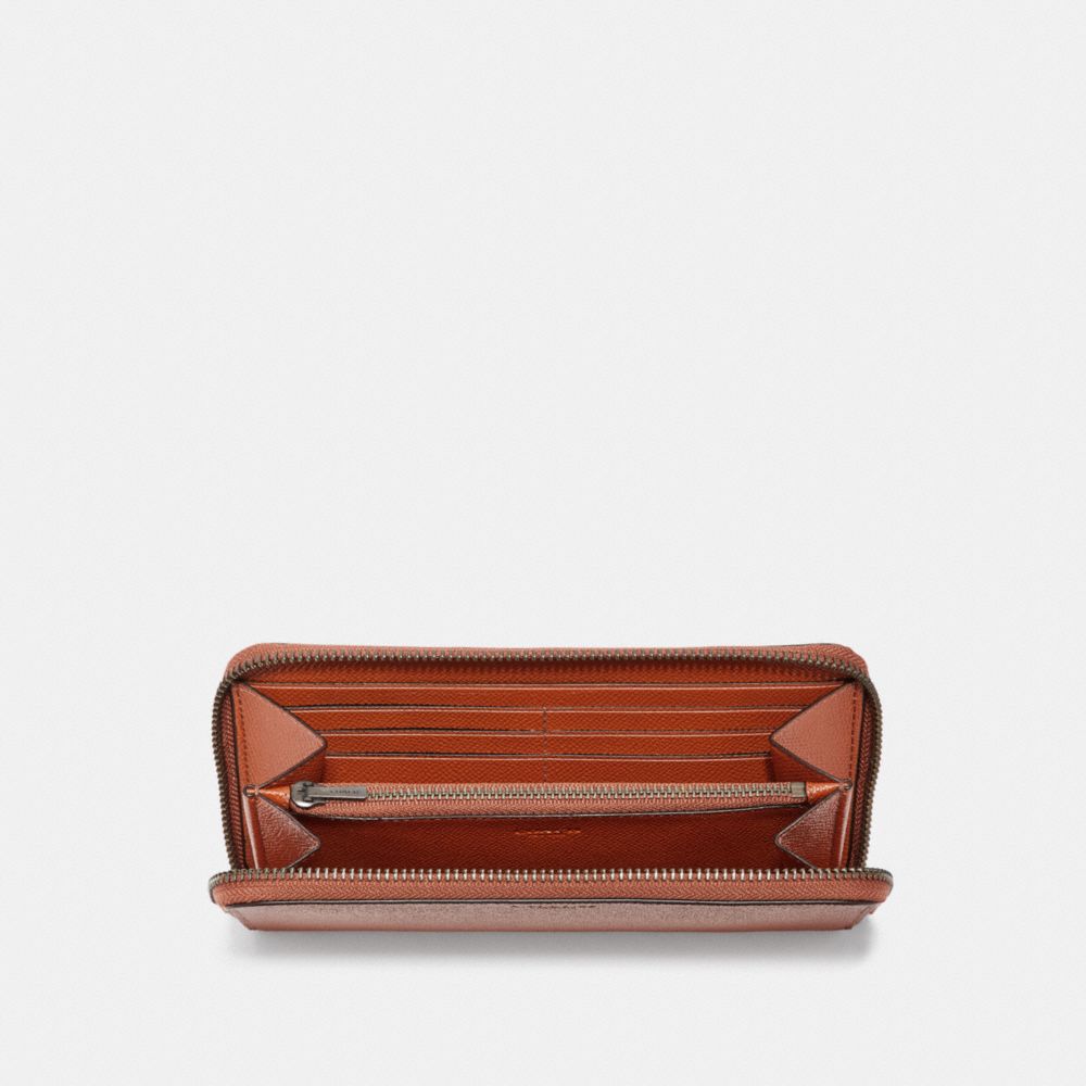 Burnished crossgrain leather| 12 credit card slots| Full-length bill compartments| Zip coin pocket| Zip-around closure| Outside open pocket| 7 1/2" (L) x 4" (H) x 3/4" (W)| Fits all phone sizes up to an iPhone X and Samsung S7 Edge