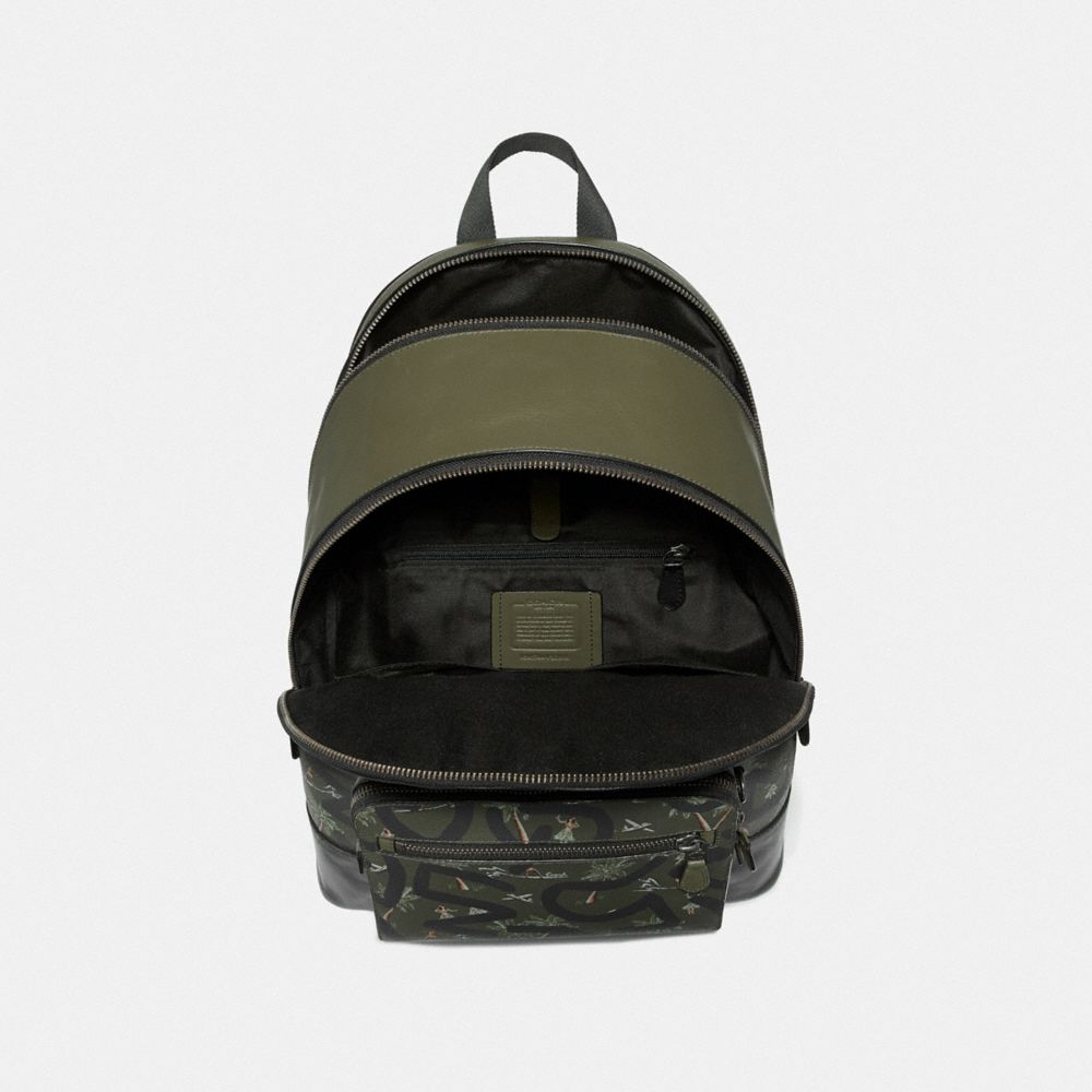 | Printed coated canvas and refined calf leather| Two separate main compartments with zip closures| Inside zip and multifunction pockets| Inside tech sleeve with secure tab| Fabric lining| Top handle with 2 1/2" drop| Outside zip pockets| Adjustable shoulder straps| 13 3/4" (L) x 17 1/4" (H) x 6" (W)| Coach x Keith Haring collection| © Keith Haring Foundation. Licensed by Artestar, New York.