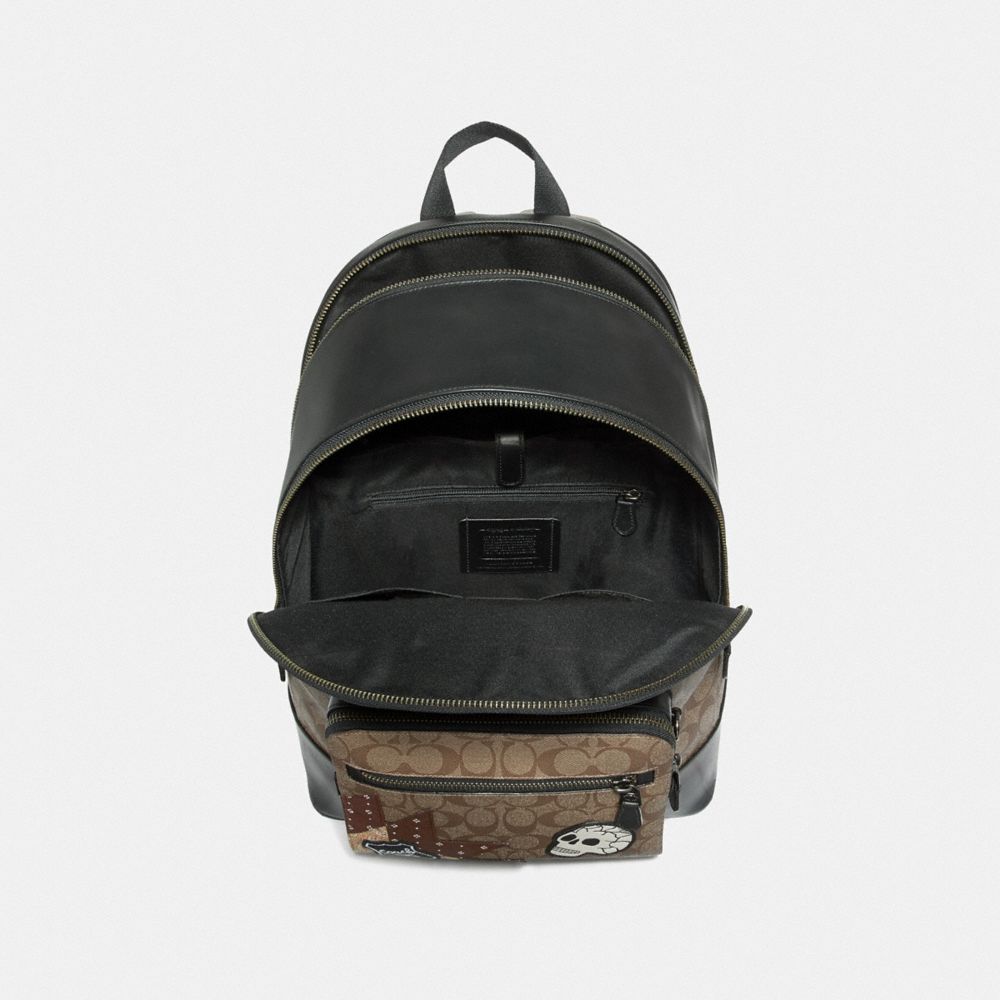 | Signature coated canvas and refined calf leather| Two separate main compartments with zip closures| Inside zip and multifunction pockets| Inside tech sleeve with secure tab| Fabric lining| Top handle with 2 1/2" drop| Outside zip pockets| Adjustable shoulder straps| 13 3/4" (L) x 17 1/4" (H) x 6" (W)| Coach x Keith Haring collection| © Keith Haring Foundation. Licensed by Artestar, New York.